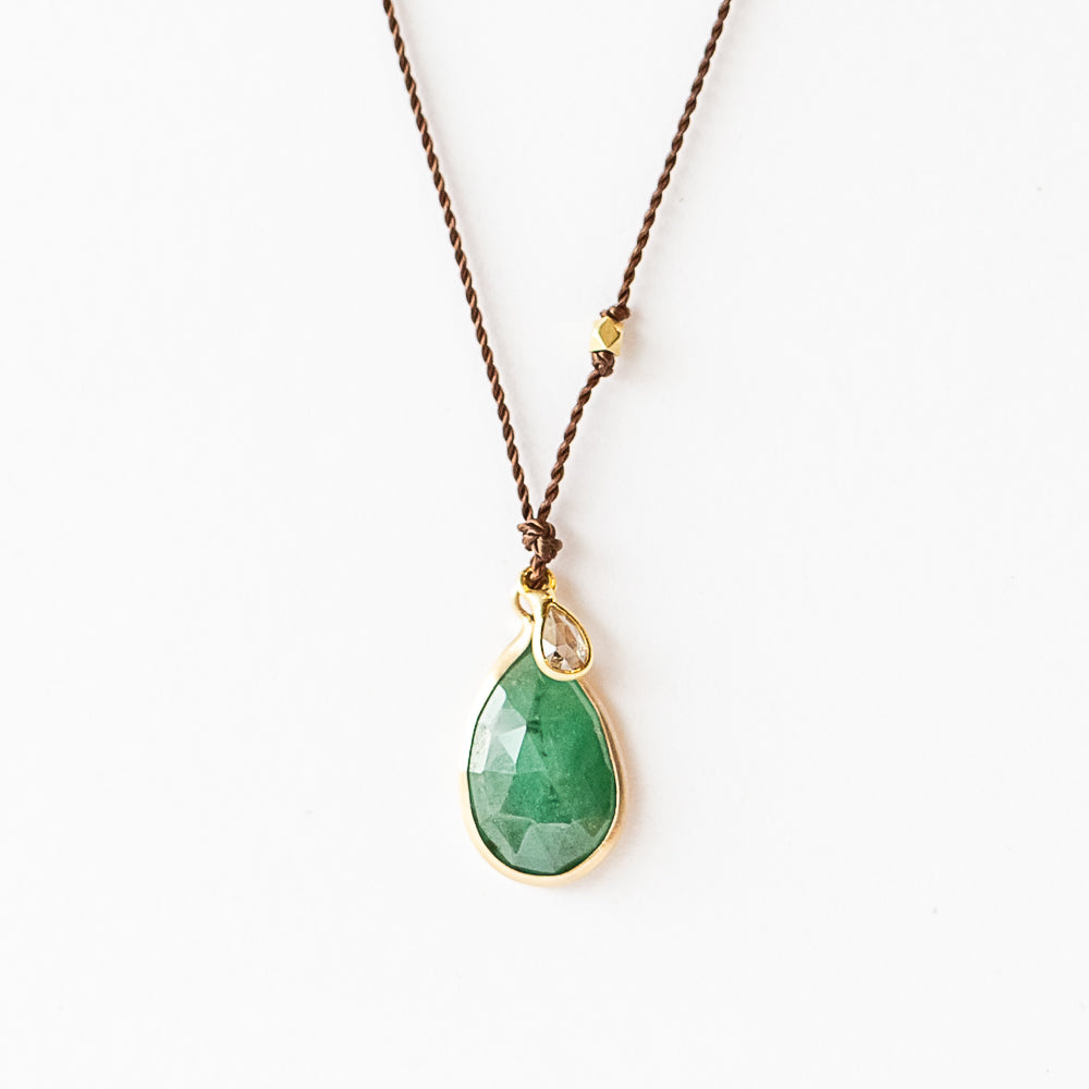 Margaret Solow | Teardrop Emerald Cord Necklace with Tiny Diamond Dangle