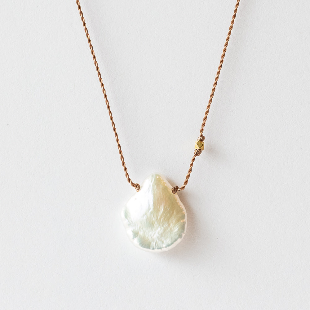 This teardrop keshi pearl necklace feels organic and modern, its flat, iridescent white surface shimmering in the light. Strung on a minimalist nylon cord, it's understated luxury at its best, making it just as easy to dress up for evening as it is to throw on with a white tee and denim.