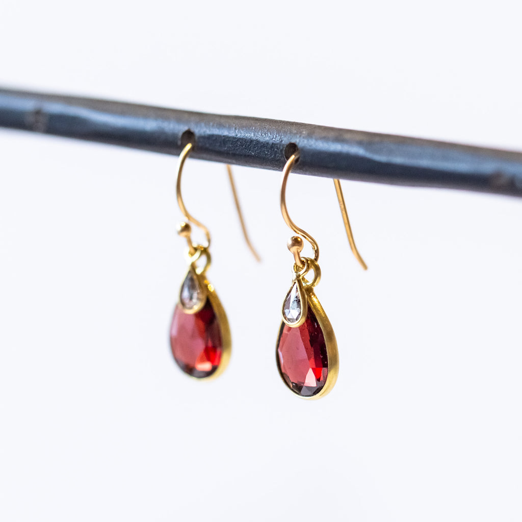 Faceted teardrop garnet and smooth diamond drop earrings bezel set in 18k yellow gold