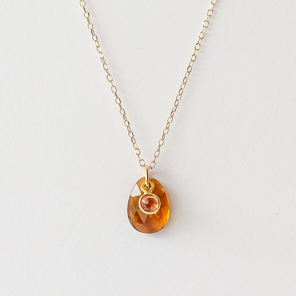 Vibrant and playful, this teardrop orange tourmaline necklace is all about warm, joyful energy. Accented with a tiny round pink sapphire dangle for a sweet pop of contrast, and strung on a delicate 14k yellow gold chain, it hits at a perfect length to layer or wear solo.