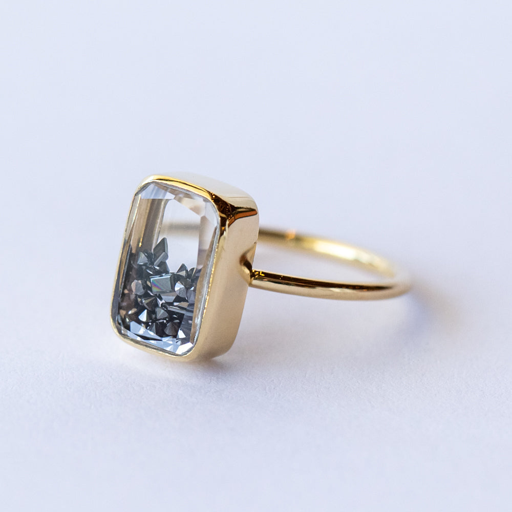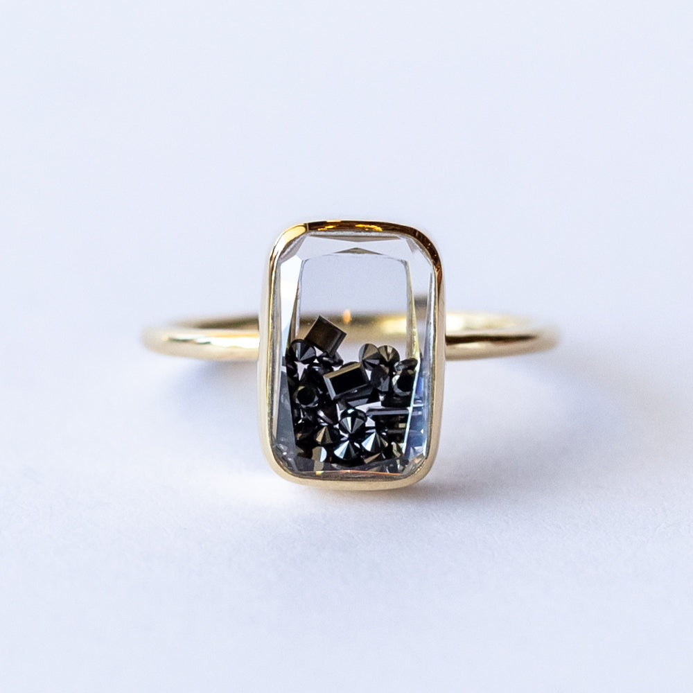 Set in sleek 18k yellow gold, this rectangular white sapphire shaker features glittering loose black diamonds swirling inside.