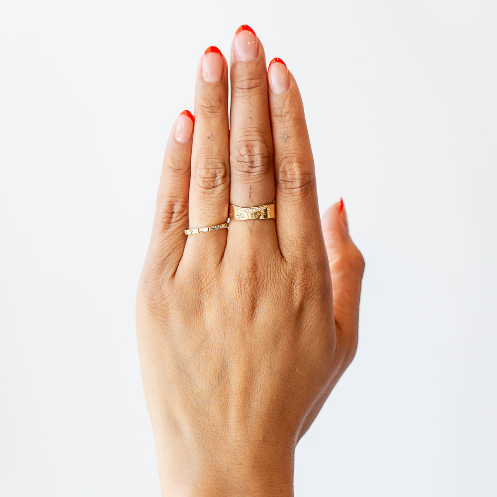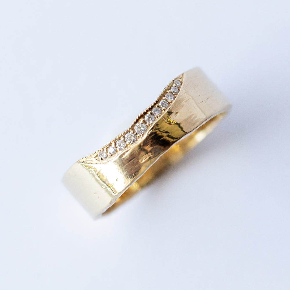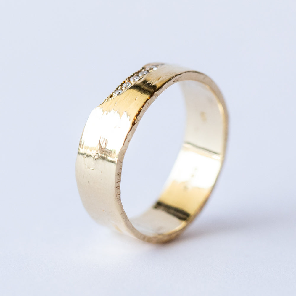 Forge your own path with a wide gold band that reflects your own style. The Trail 6mm Diamond Ring by Misa is a modern heirloom with a soulful, hand-hewn feel. Crafted in 14k yellow gold with an organic, textured surface, this flat 6mm band is set with a delicate, asymmetrical trail of round brilliant diamonds along its top edge. Made to mark a milestone or add quiet strength to your everyday stack.