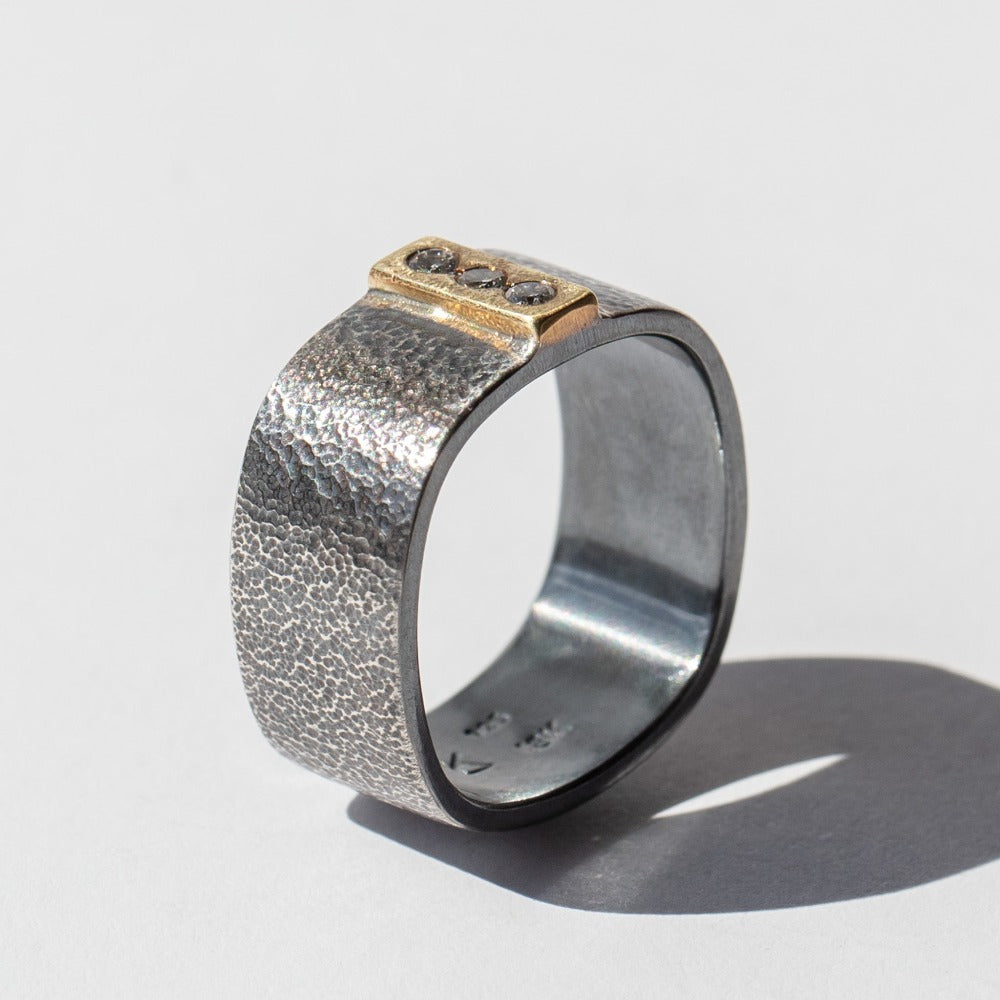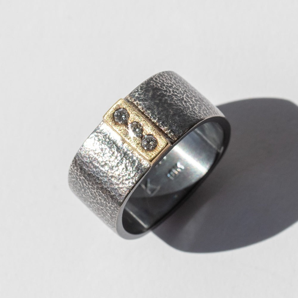 Textured oxidized sterling silver band with three white diamonds flush set in 18k yellow gold