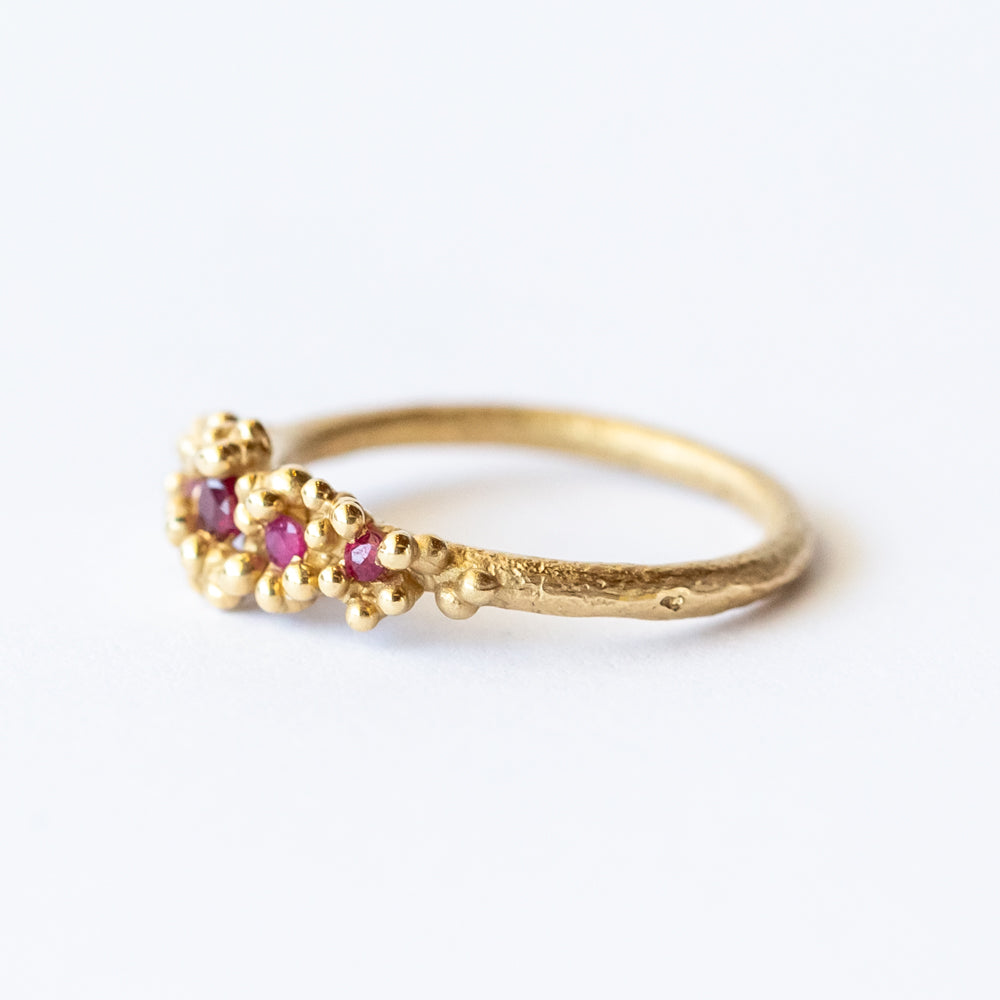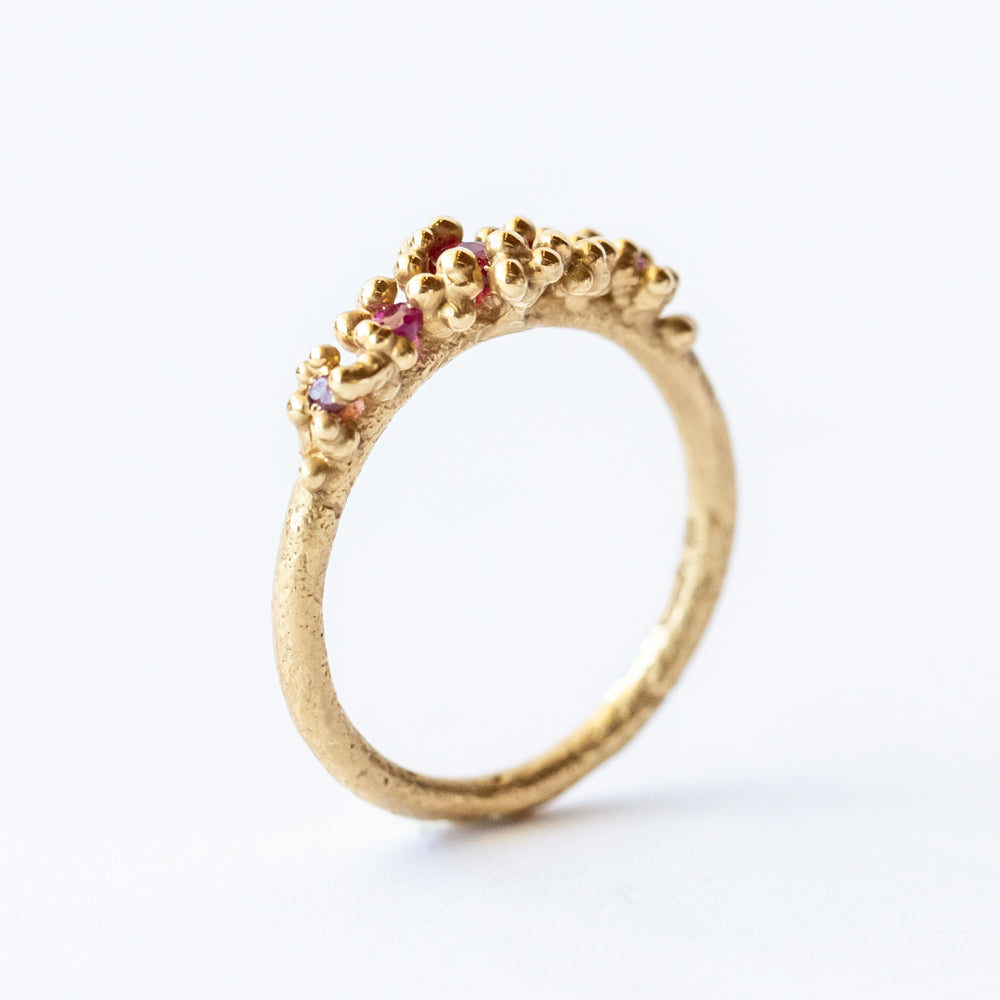 For someone who likes their jewelry a little unconventional, this ruby ring with granules from designer Ruth Tomlinson is the perfect mix of edgy and romantic. Featuring five vibrant red rubies that seem to float among clusters of golden granules, this ring has a beautifully organic, handcrafted feel. The gently textured 18k yellow gold band adds a touch of warmth, making those rubies really pop.