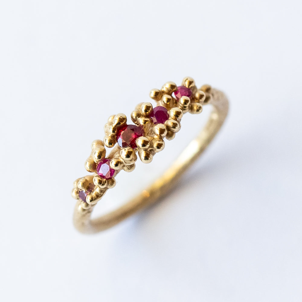 Rubies, the July birthstone, are known for their fiery energy and are said to symbolize passion, courage, and vitality—perfect for someone who likes their jewelry with a little heat. This piece works beautifully as a ruby wedding band, an alternative engagement ring, or just a stunning right-hand piece for someone who loves their jewelry a bit off the beaten path.