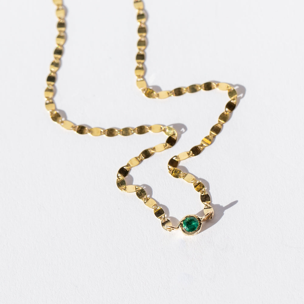This unique flat, sparkling chain necklace from Communion by Joy is accented with a vibrant green emerald—the birthstone for May babies—bezel set at its center for an everyday pop of color. Wear it alone for a minimal look that goes perfectly with everything from jeans and a tee to a summer dress. Or pile it high with other necklaces to create a layered look.