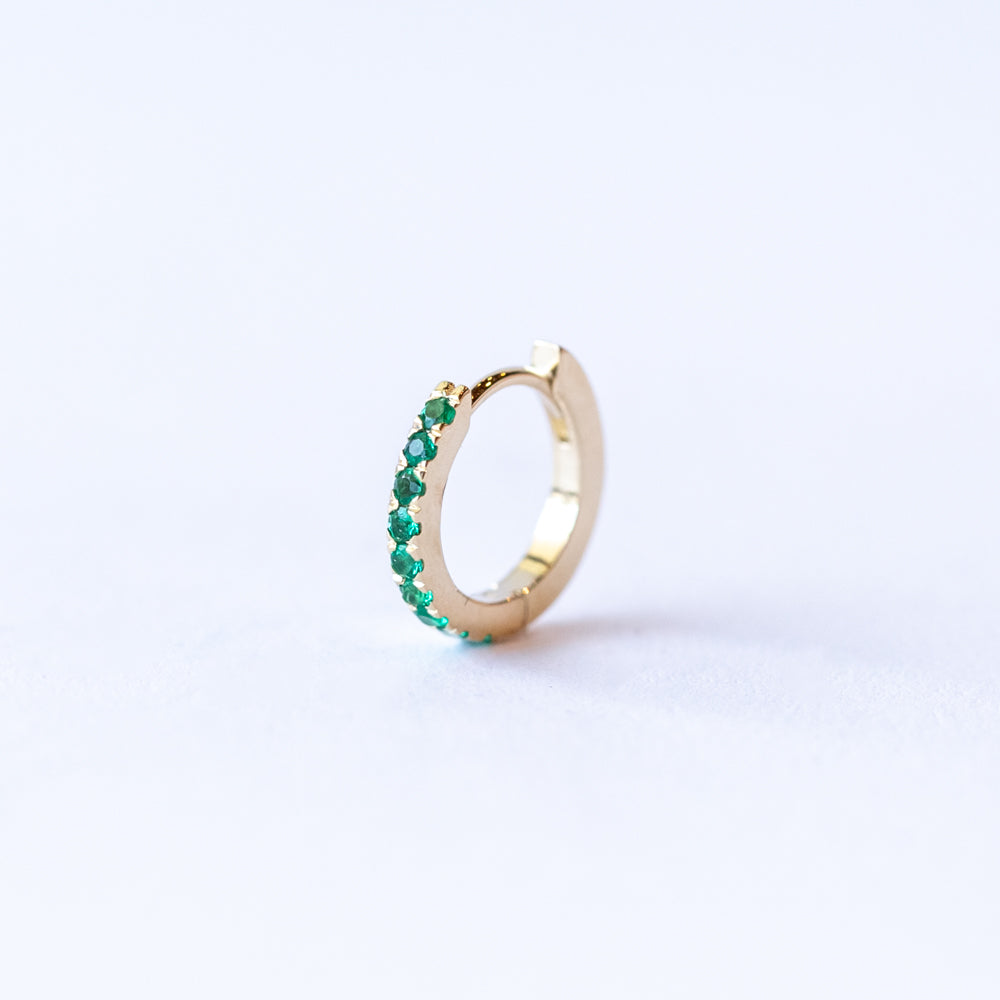 This little emerald huggie from Jack + G is a tiny powerhouse of versatility. It's a hinged hoop with emeralds down the front, but you can flip it around depending on your mood. Show off the colorful fishtail pavé emeralds when you want sparkle up front, or flip it around for a sleek, all-metal moment.