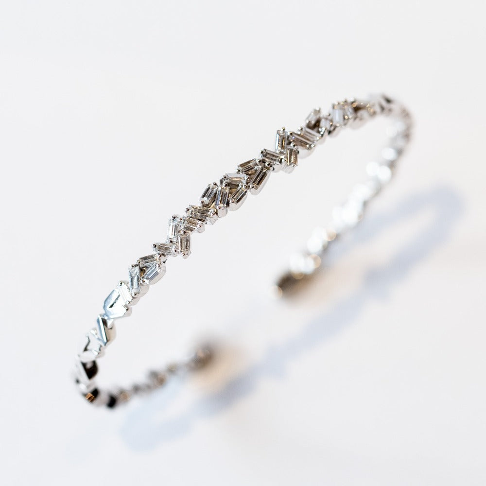 This diamond bangle is handcrafted with an 18-karat spring gold wire making it flexible to slip on and off. The scattered baguette setting allows more light to shine through the diamonds.