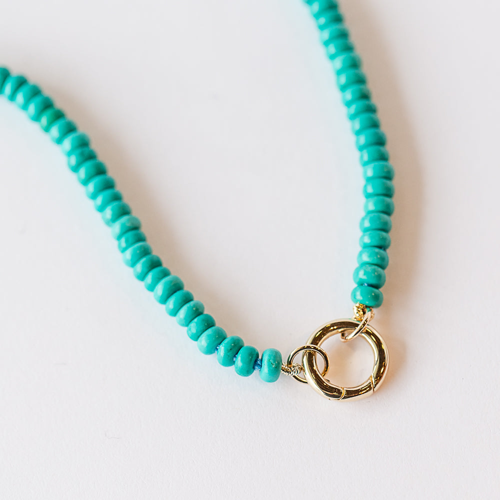 A pop of color and plenty of versatility—this turquoise beaded necklace is just the thing your collection needs. The round charm enhancer lets you add your choice of charms (sold separately) to the necklace with ease.