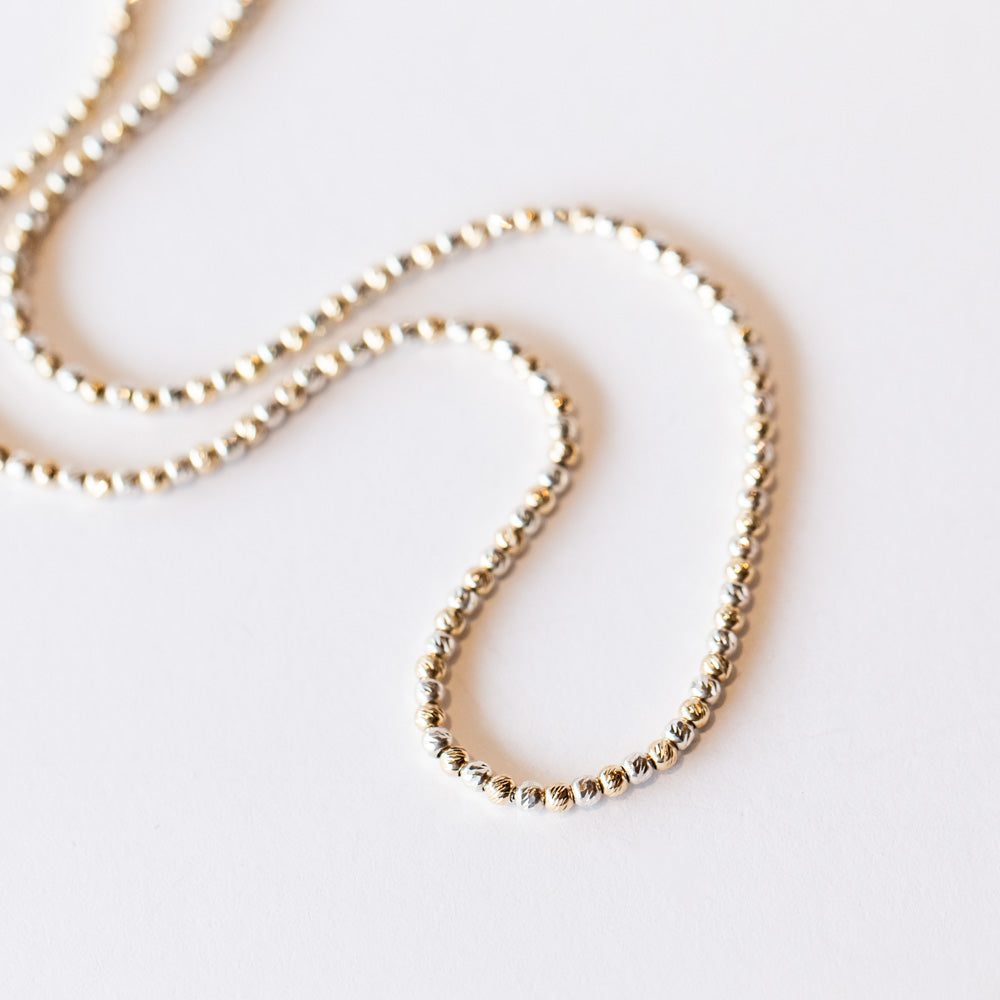 This glittering necklace for women brings together the perfect balance of shimmer and sophistication. A mix of faceted 14k yellow gold and sterling silver beads is delicately strung on a dainty chain, creating a design that moves freely and catches the light from every angle. This versatile piece adds a subtle sparkle to any outfit, making it a timeless addition to your collection, whether worn alone or layered for extra elegance.