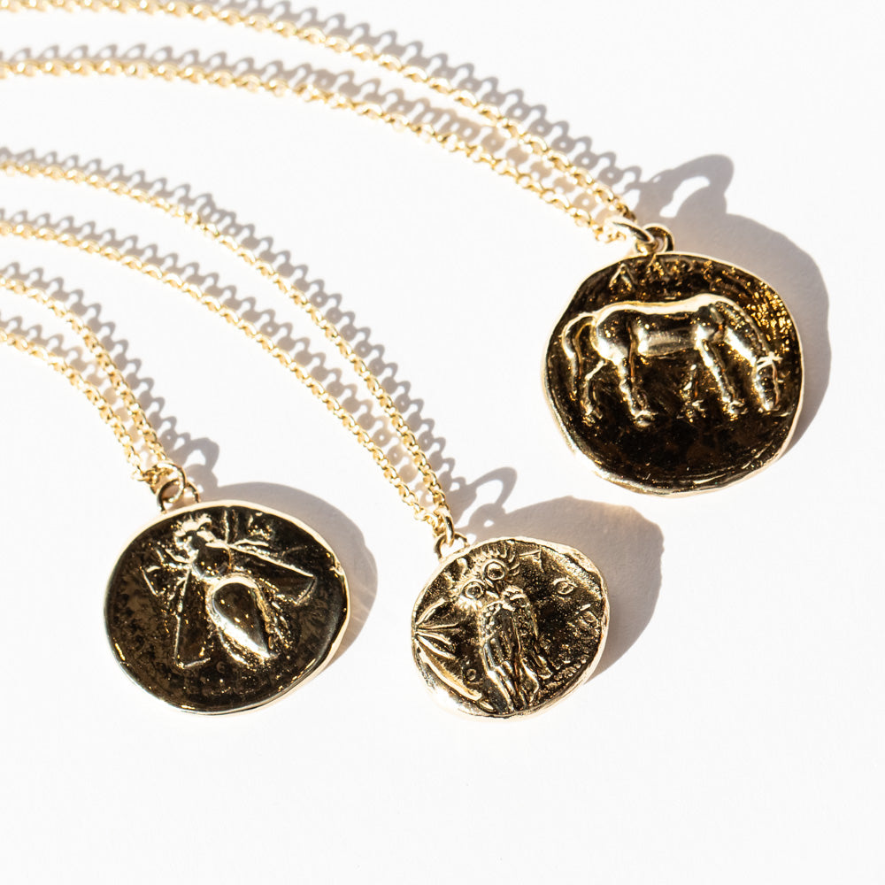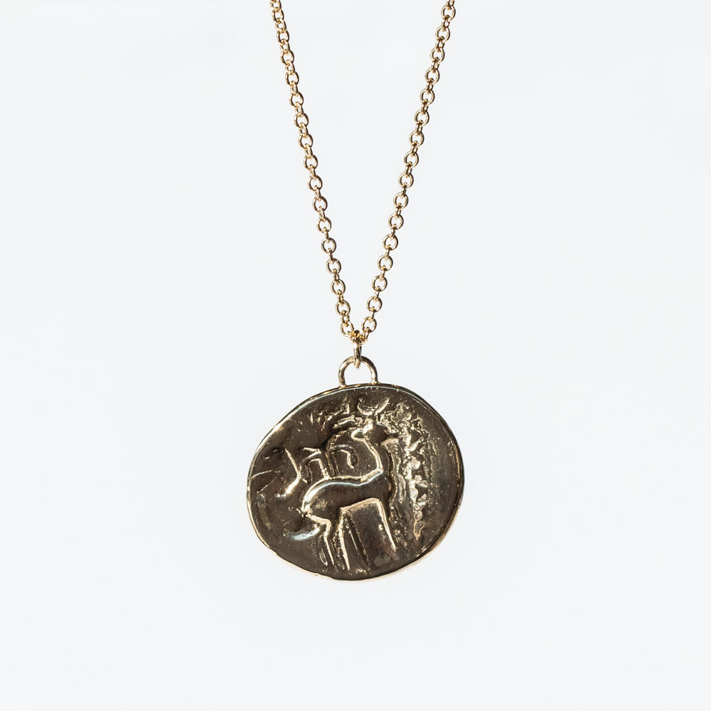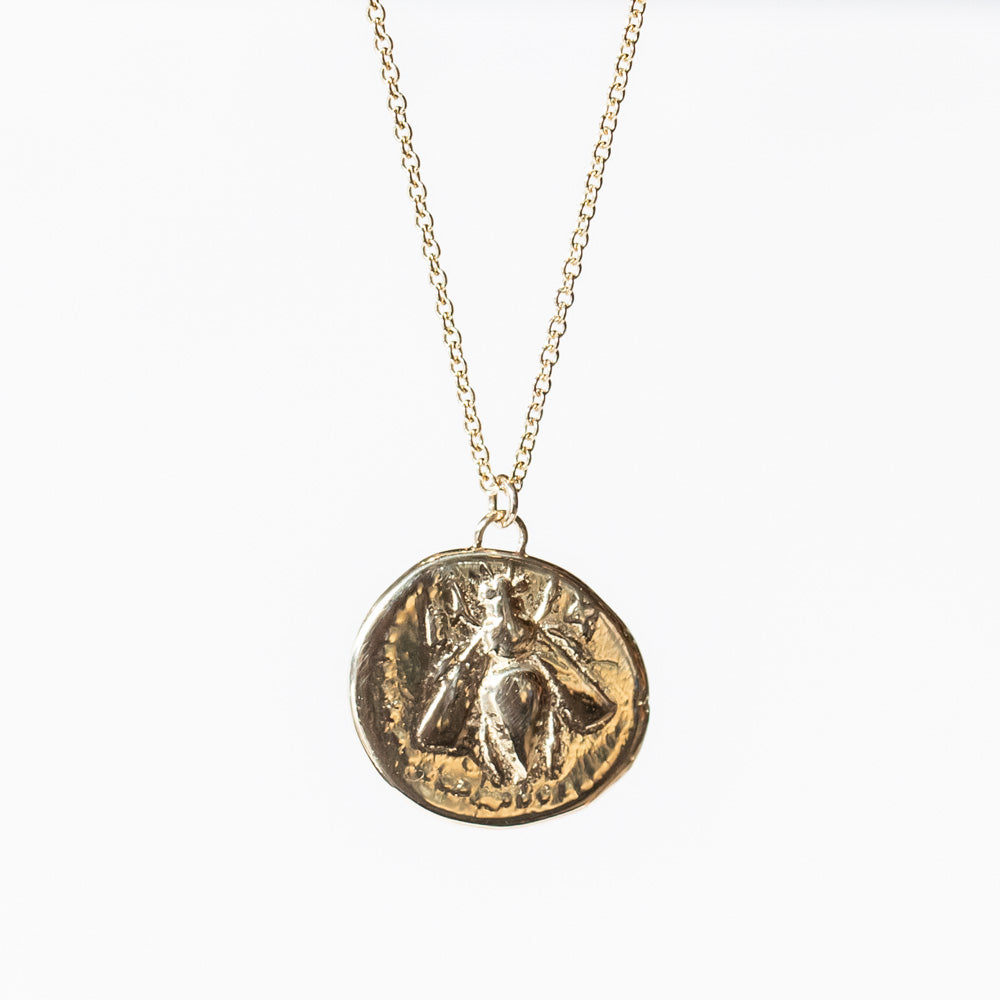 Channel the ancient beauty of Greek mythology with this 14k gold necklace, featuring a pendant molded from an ancient Greek coin. One side depicts a honeybee, the symbol of Artemis, goddess of the hunt and wilderness. On the reverse, a stag—sacred to Artemis—represents her role as protector of wildlife and the natural world.