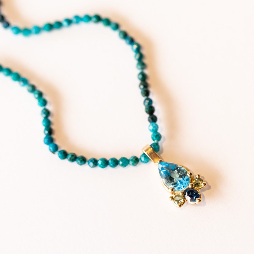 Beaded blue topaz, blue sapphires, green sapphires, and chrysoprase set in 9k yellow gold