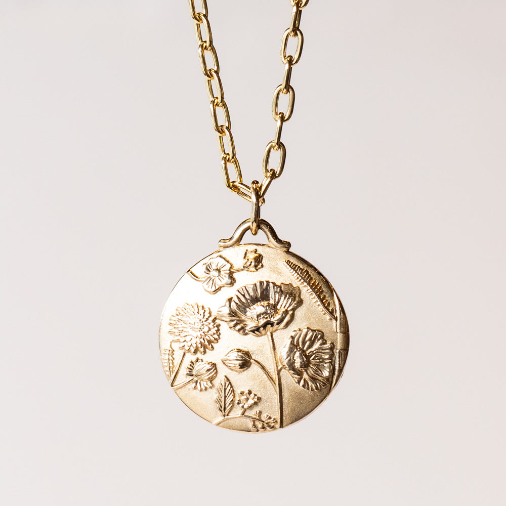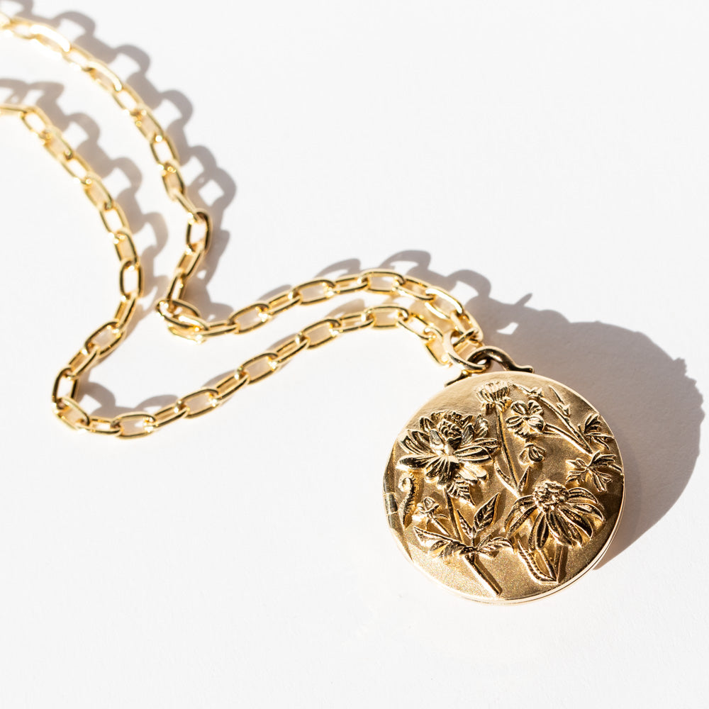 Forever blooms: carry a bouquet with you everywhere you go. This timeless keepsake from Kathryn Bentley is a stunning piece of nature and craftsmanship. It's a 14 karat yellow gold round locket adorned with intricate botanical details. Use it to frame your favorite photographs or special mementos, this locket is the perfect blend of elegance and sentimentality—an heirloom-worthy piece that keeps your cherished memories close to your heart.