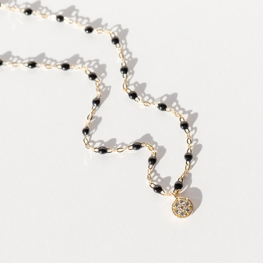 If you like the look of a classic Gigi necklace, with its glossy resin beads on polished gold, then you'll love this upgraded version with its dainty pave diamond disc at the center. It adds just the right amount of sparkle, whether you're rocking it solor or layered with other chains to create a look that's all your own.
