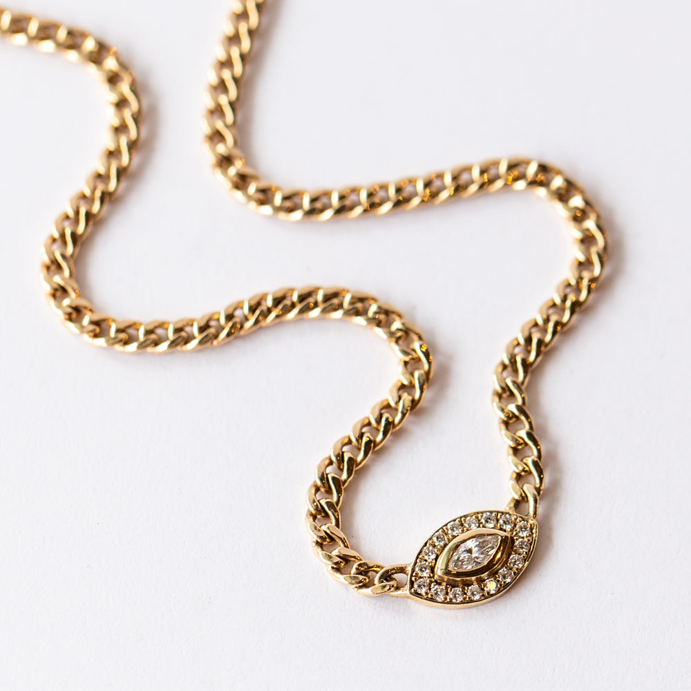 Chunky meets chic in this seriously cool twist on the classic gold chain necklace. The star of the show? A horizontal, east-west marquise diamond, bezel set and wrapped in a halo of sparkling pave diamonds—basically, major glow-up energy. This bold little beauty hangs front and center on a small curb chain that’s all about that modern, street-style vibe.
