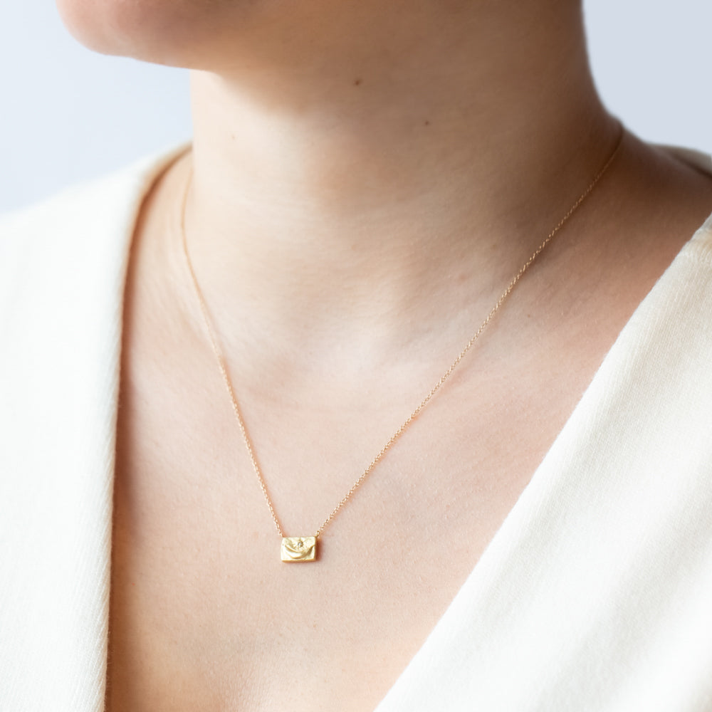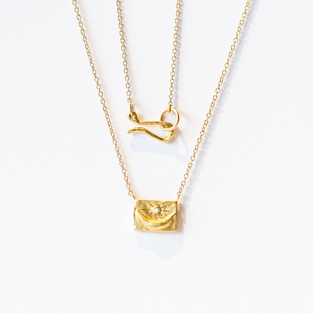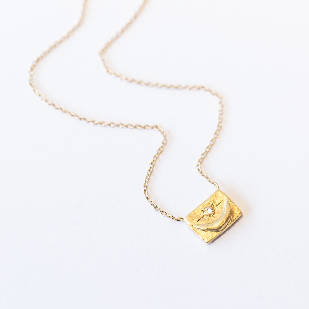 A celestial statement with a touch of mystery, this crescent moon necklace is designed to capture the beauty of the night sky. The matte-finish 18k yellow gold pendant features a luminous diamond nestled above the curve of a raised crescent moon—symbolizing intuition, transformation, and the ever-changing phases of life. Suspended from a delicate 14k yellow gold chain and secured with a handmade S-clasp, it’s an effortless piece that blends cosmic elegance with everyday wearability.