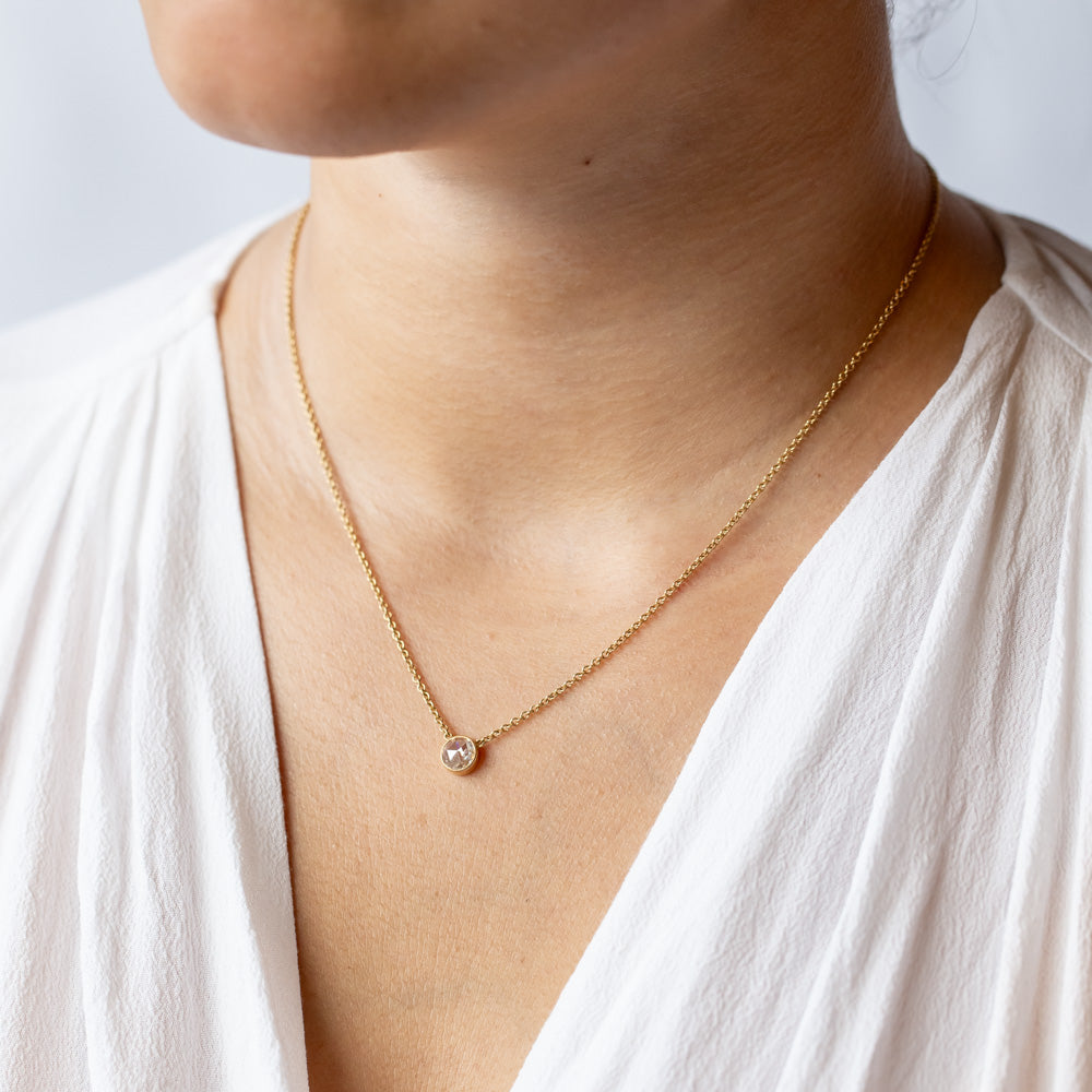 Sophisticated as can be, this Lincoln diamond necklace from Single Stone is made for those who appreciate a vintage flair with modern sensibility. A round rose cut diamond is bezel set in handcrafted yellow gold with a classic cable chain. Wear it solo as a standout piece or layer it up with other necklaces in your collection.