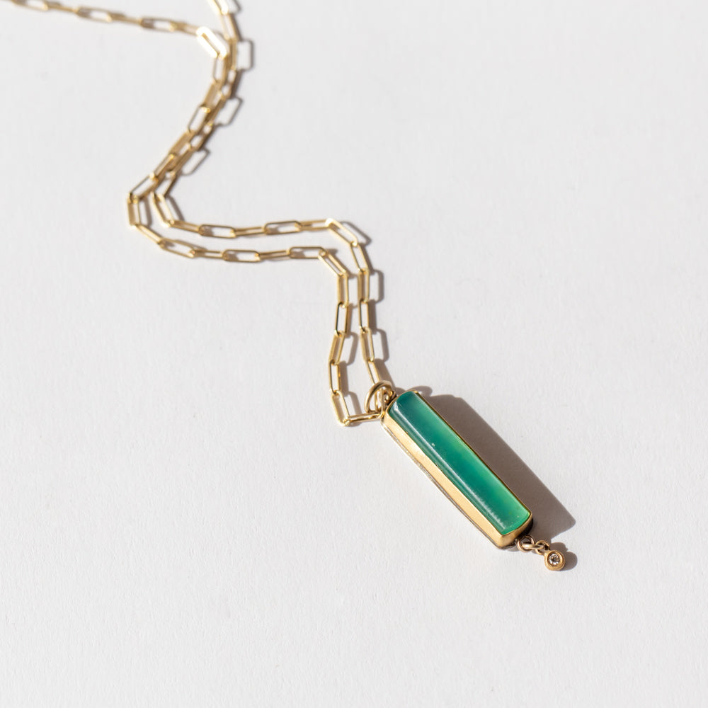 Bold yet effortlessly wearable, this gemstone necklace is the kind of piece that turns heads without trying too hard. A stunning rectangular gem silica—prized for its vibrant, almost glowing blue-green hue—is set in a rich 22k gold bezel against a sterling silver backing, creating the perfect balance of luxe and organic. A single petite diamond drop adds just a touch of shimmer and movement, like a drop of light playing across the water. Suspended from a modern gold paperclip chain, this piece layers beautifully with other necklaces in your jewelry collection or stands out worn solo. Gem silica is known for promoting clarity, communication, and positive energy, making it a meaningful gift for someone special (or yourself—because you deserve it). The ultimate in gemstone necklaces and one of the best gifts for women, this beauty is a no-brainer jewelry gift for her.