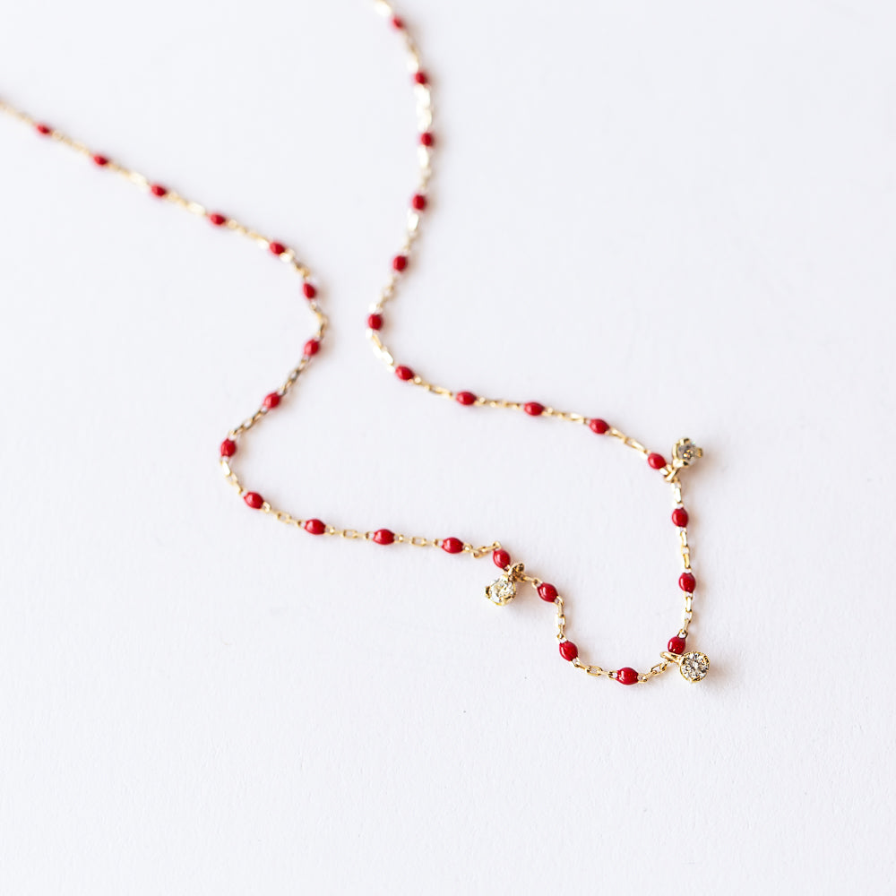 The Mini Gigi Poppy Necklace is all about joyful minimalism with a luxe twist. Three sparkling diamonds dance along a strand of glossy poppy-red resin pearls on polished 18k yellow gold chain. It's vibrant, delicate, and designed to be worn daily—whether layered with your favorite chains or shining solo. A feel-good piece that’s as fun as it is refined.
