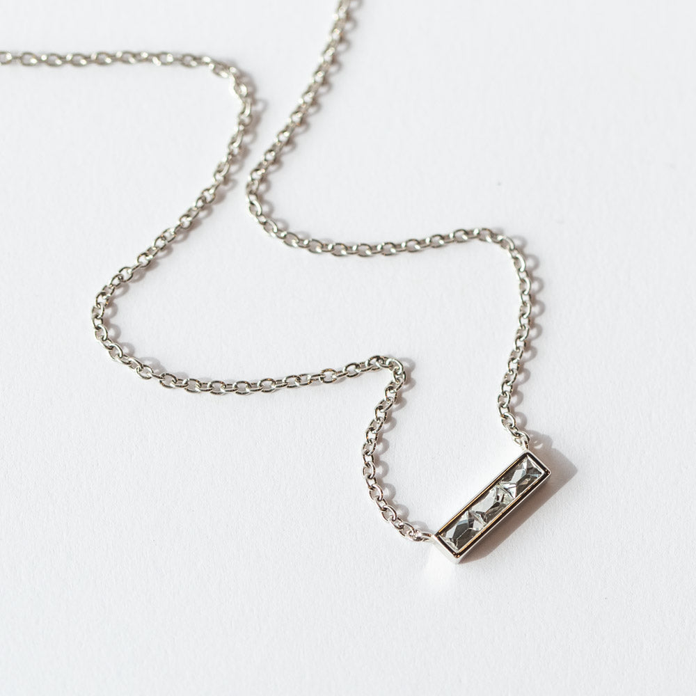 The Monet Necklace from Single Stone is quiet brilliance in its purest form. Three French cut diamonds are perfectly aligned in a sleek platinum bezel, creating a modern take on the classic diamond bar necklace.