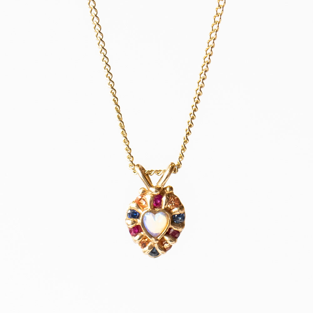 Orange and blue sapphires bezel set around a fiery opal heart in 9k yellow gold