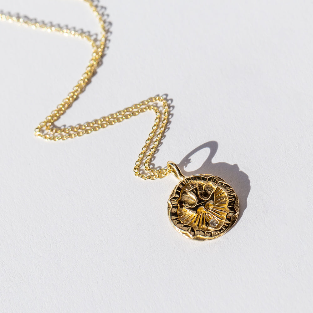 Replicated from a 1930s Vintage French Medallion, this carved gold pendant from Communion by Joy features a dove, an emblem of purity and inspiration, along with a single small diamond. It hangs from a classic cable chain necklace.
