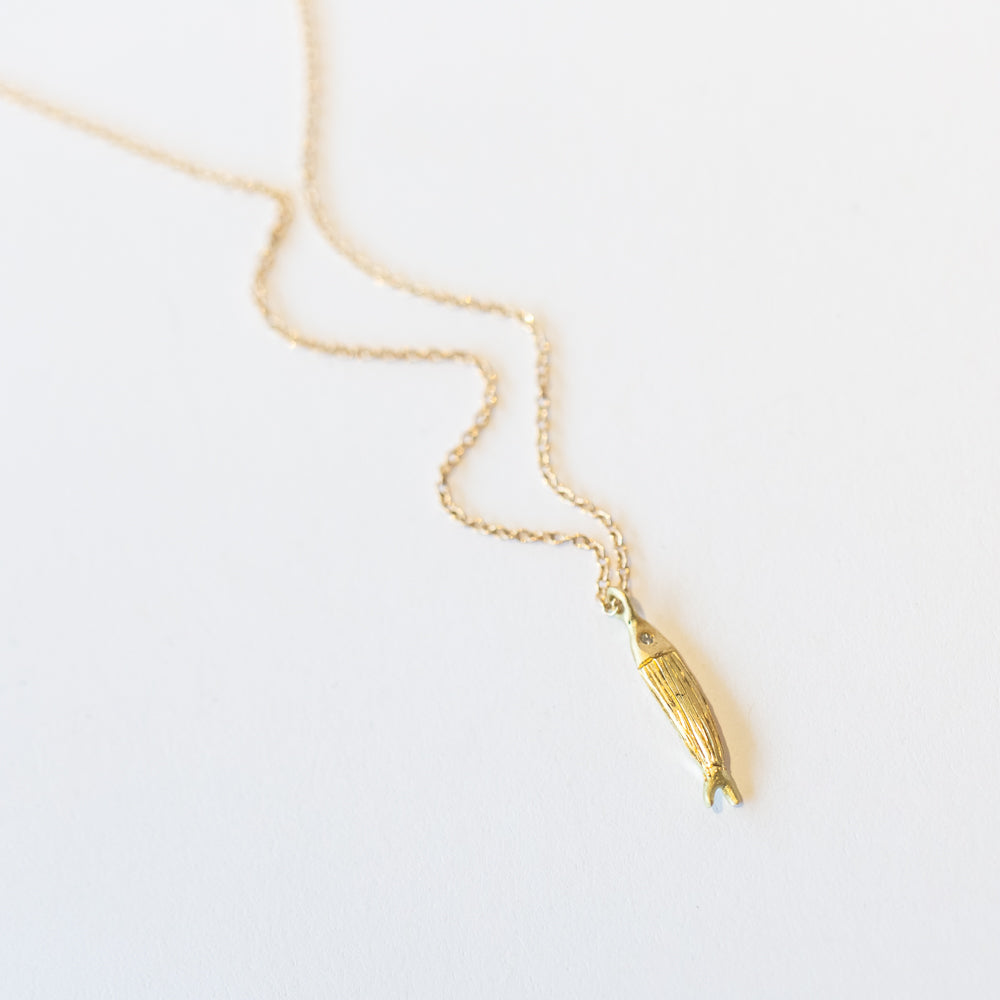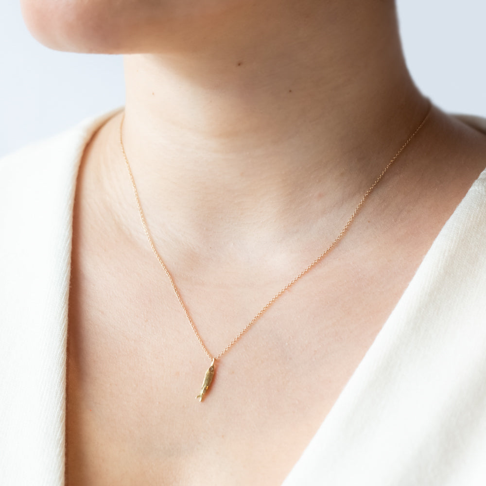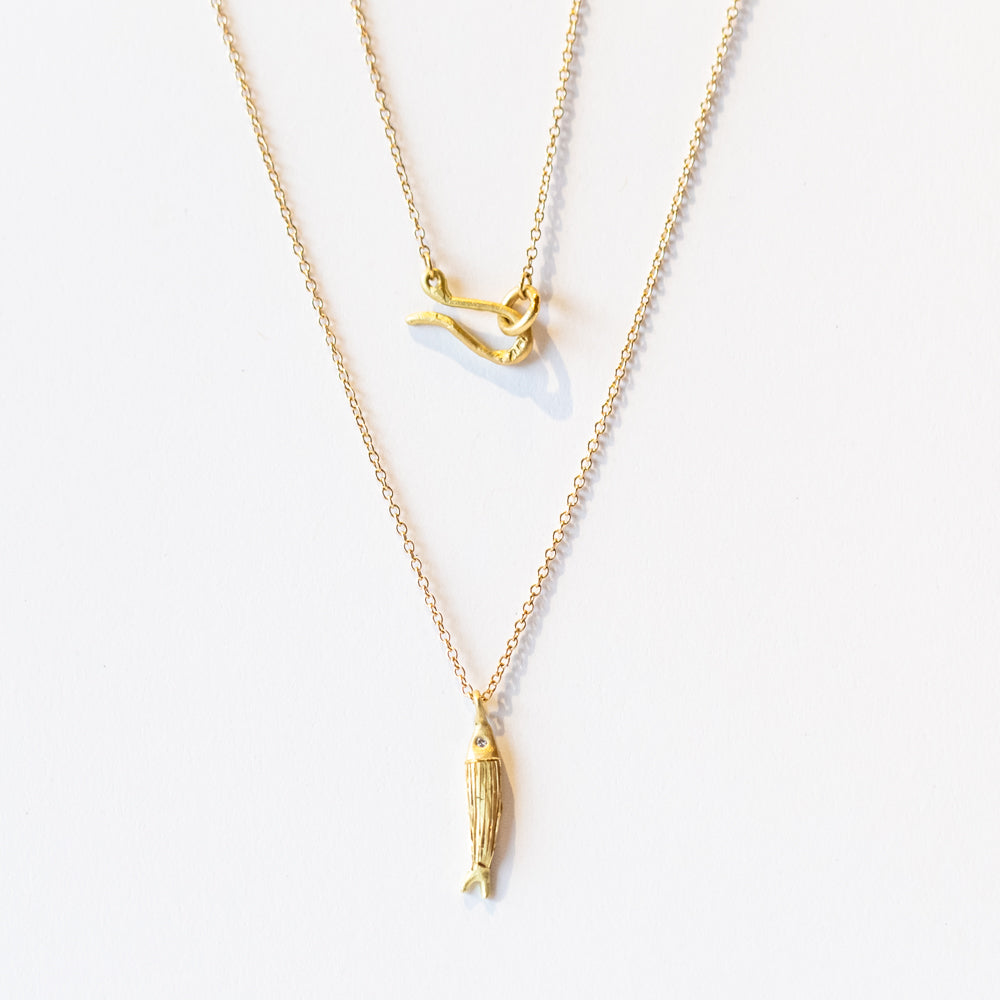 This little fish is serving major charm with a side of sparkle. Hand-engraved in rich 18k yellow gold, this playful pendant takes the shape of a fish—because why not add a little whimsy to your fine jewelry game? Its reclaimed white diamond eyes (because even fish need a little bling) bring just the right amount of shimmer. Strung on a delicate-yet-durable 14k gold cable chain, it’s finished with a signature S-hook clasp that’s as stylish as it is secure. A quirky, luxe addition to your everyday lineup.