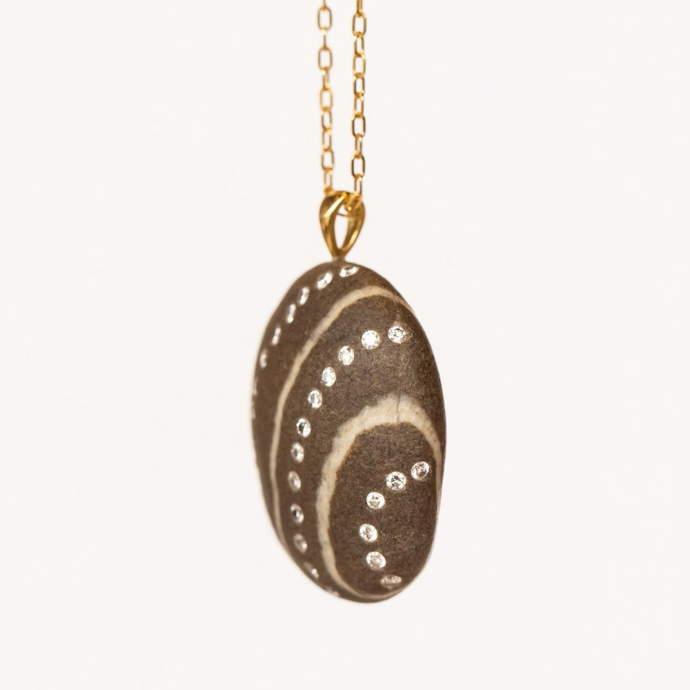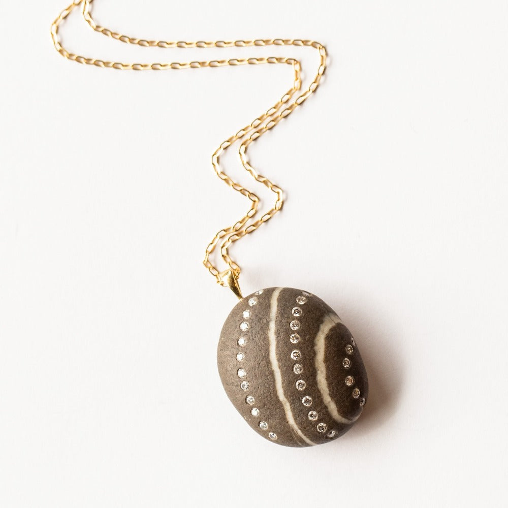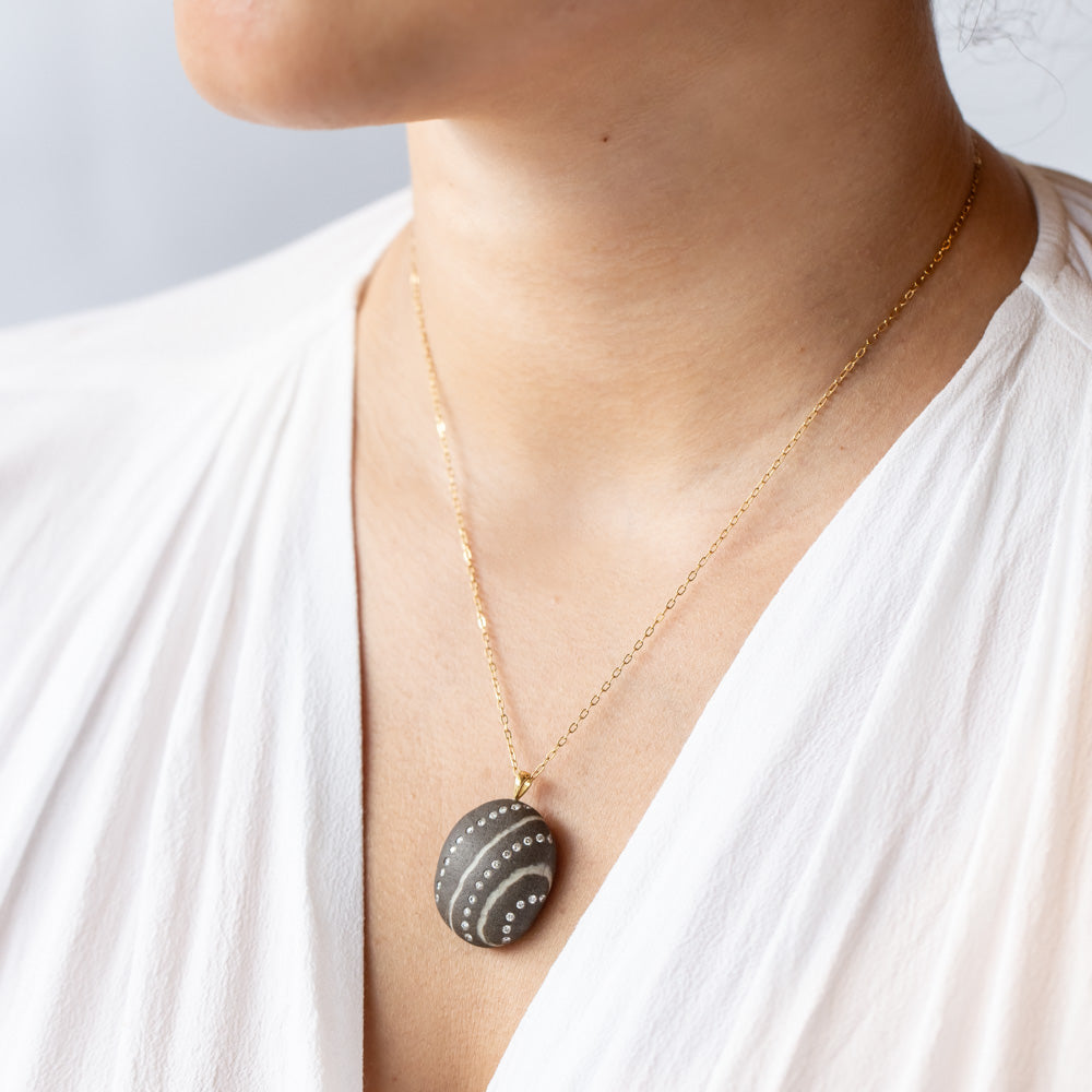 The Waves necklace is a harmonious blend of nature’s artistry and refined craftsmanship. This one-of-a-kind piece features a deep gray, oval-shaped beach stone, marked by soft, organic white curved lines reminiscent of ocean tides. Three delicate rows of flush-set white diamonds follow the stone’s natural patterns, adding a shimmering echo of movement and light. Suspended from an 18-inch 18k yellow gold paperclip chain, this pendant feels both grounding and ethereal—perfect for those drawn to the quiet power of the sea and the timeless beauty of natural elements.