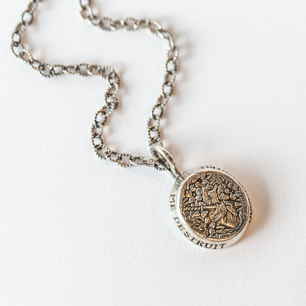 Love, loss, life... the phrase 'Quod Me Nutrit Me Destruit', which translates to 'That Which Nourishes Me Also Destroys Me', is emblazoned around this chunky silver pendant necklace. The front features an engraved anatomical heart, pierced by a dagger and surrounded by florals.
