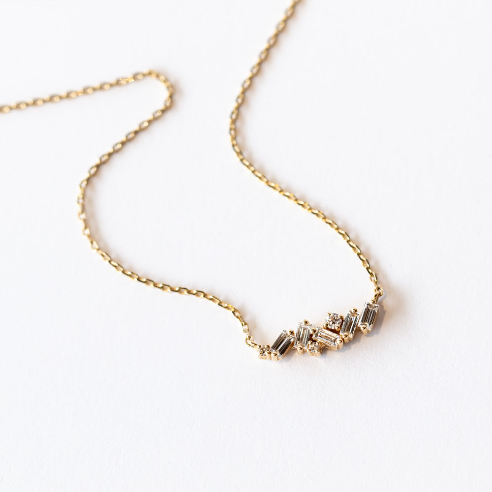 This diamond pendant is a beautiful combination of baguette and round diamonds. It is a great piece for everyday wear and we love recommending this piece for gifting.