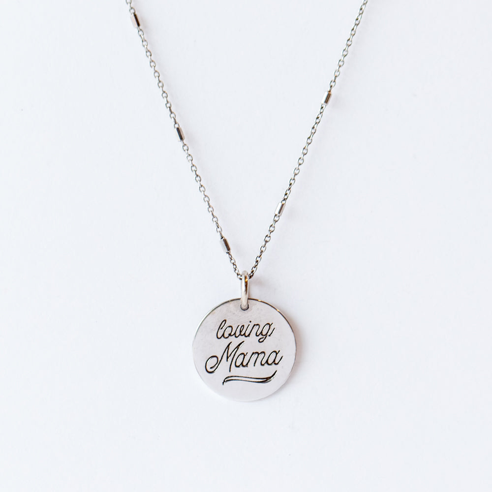 Whether for Mother's Day, a new baby (we love a cute push present), or just because you love her, treat mom to this sweet pendant to commemorate her wonder. Strung on a cable chain accented with tiny shimmering white gold bars, a round disc pendant is engraved with "loving mama" in script.