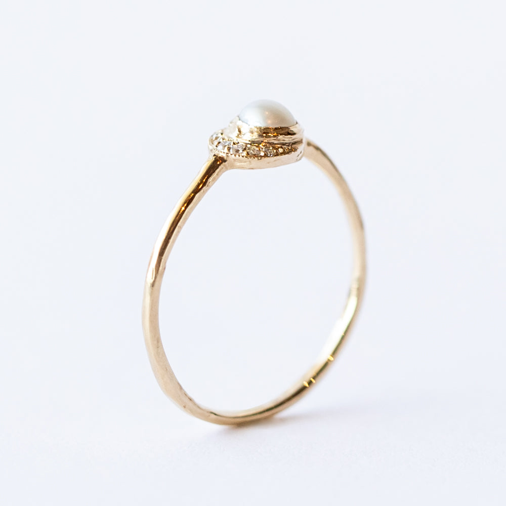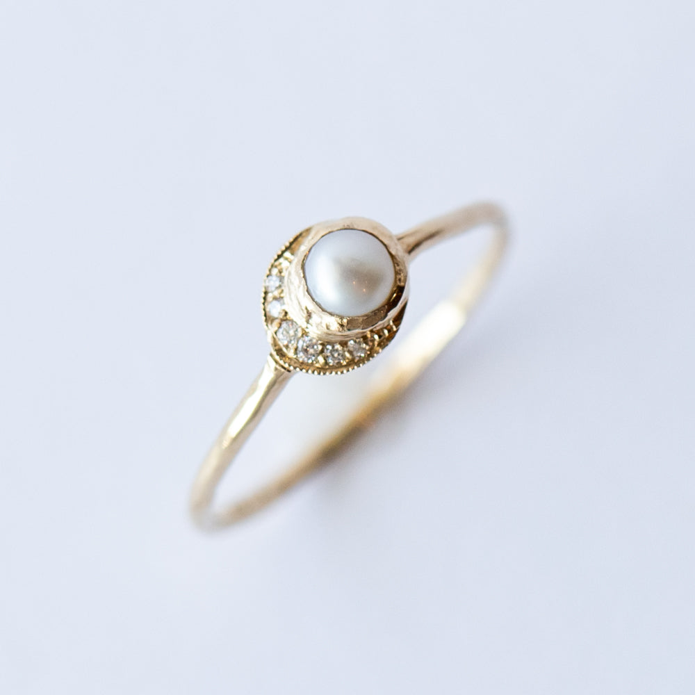 We love Misa’s Baby Moon Pearl Ring for a sweet, symbolic nod to the divine feminine. Centered around a glowing white freshwater pearl—beloved for its connection to intuition, inner peace, and emotional clarity—this dainty ring sparkles with a touch of white diamond brilliance.
