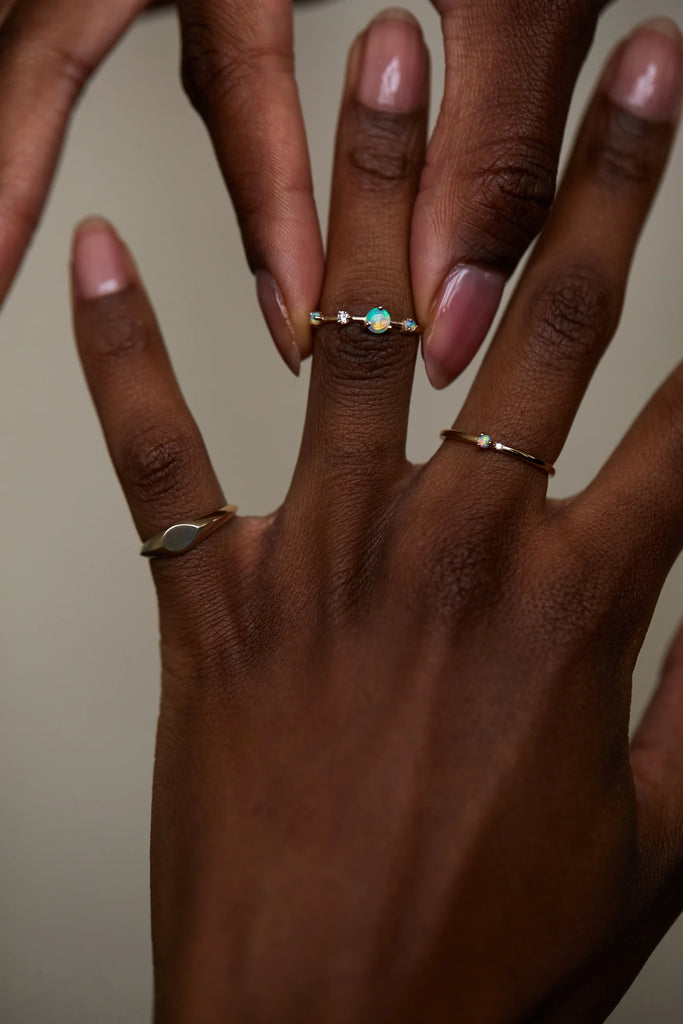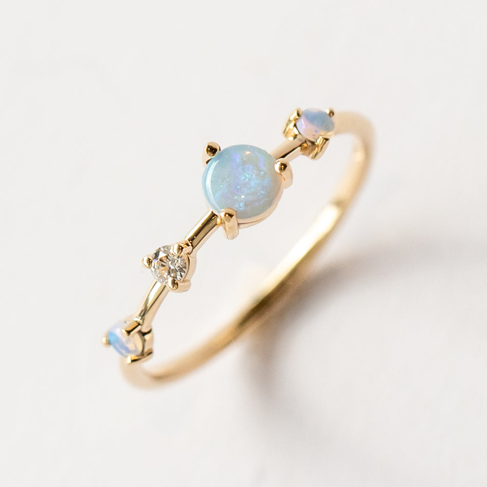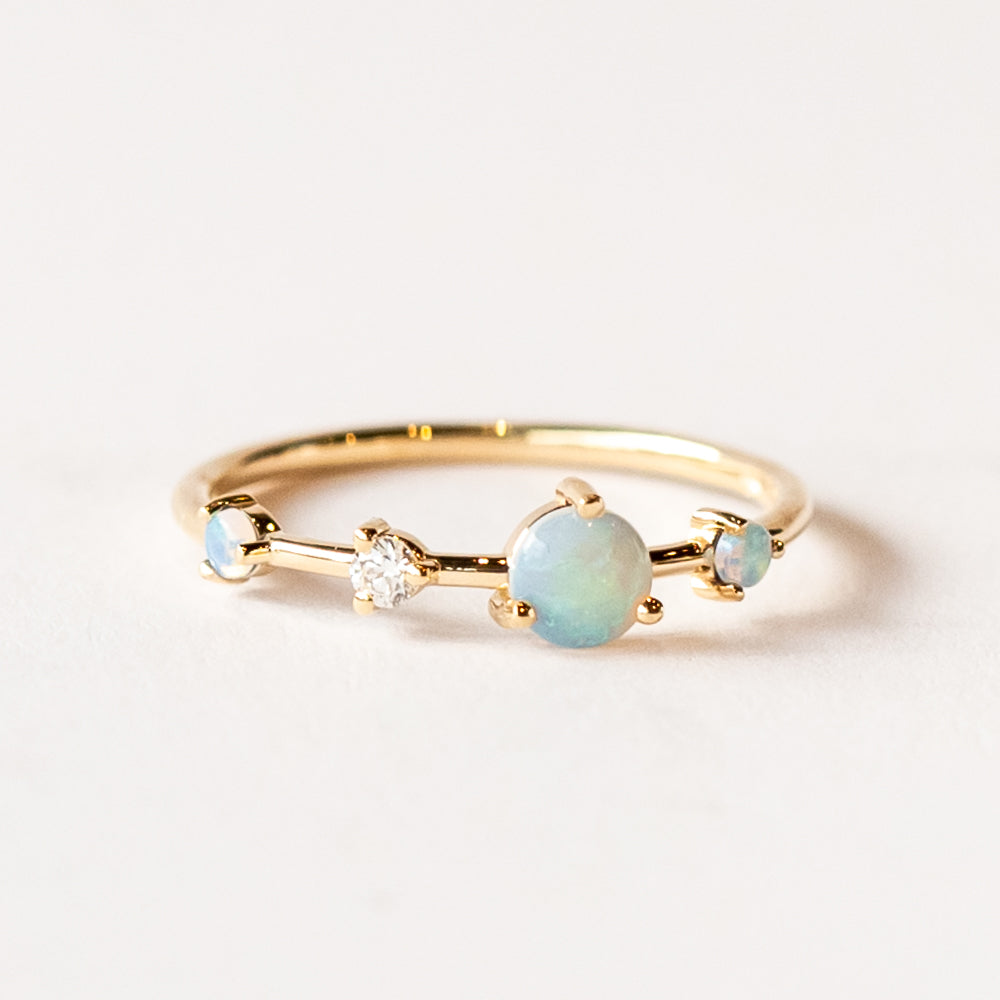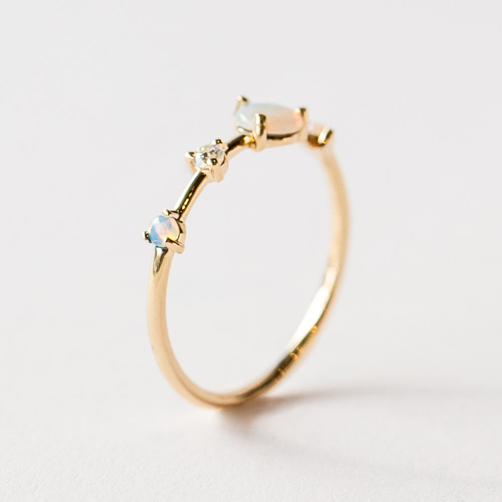 This simple design is completely stunning. A slender gold band is accented by three shimmering opals and one dainty diamond for a hint of brilliance. It makes a beautiful October birthstone jewelry gift, or a special treat for anyone who appreciates dainty rings and glowing gemstones.