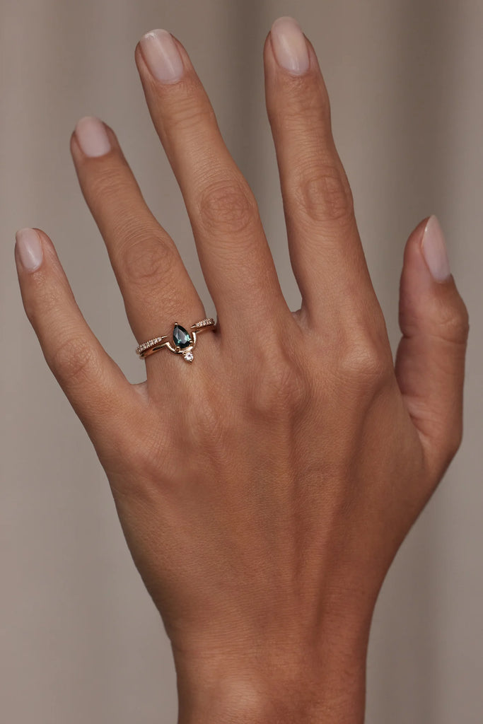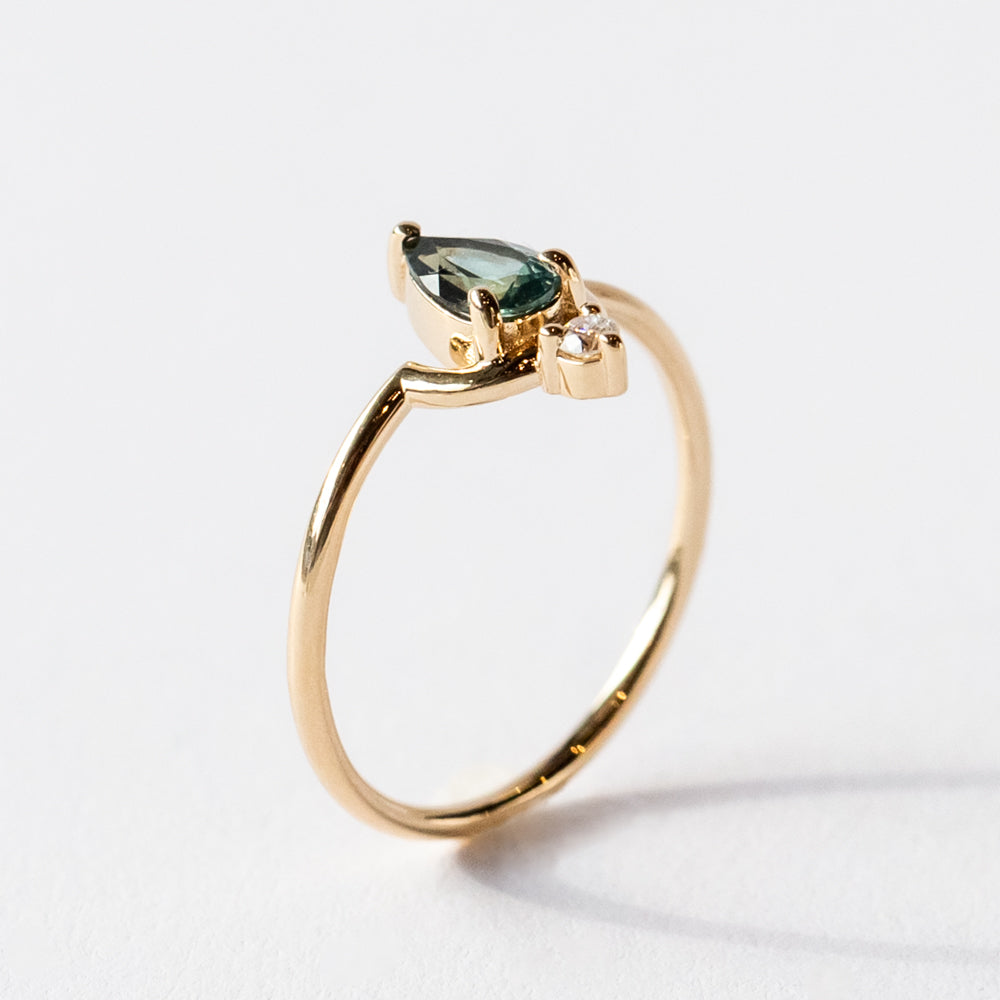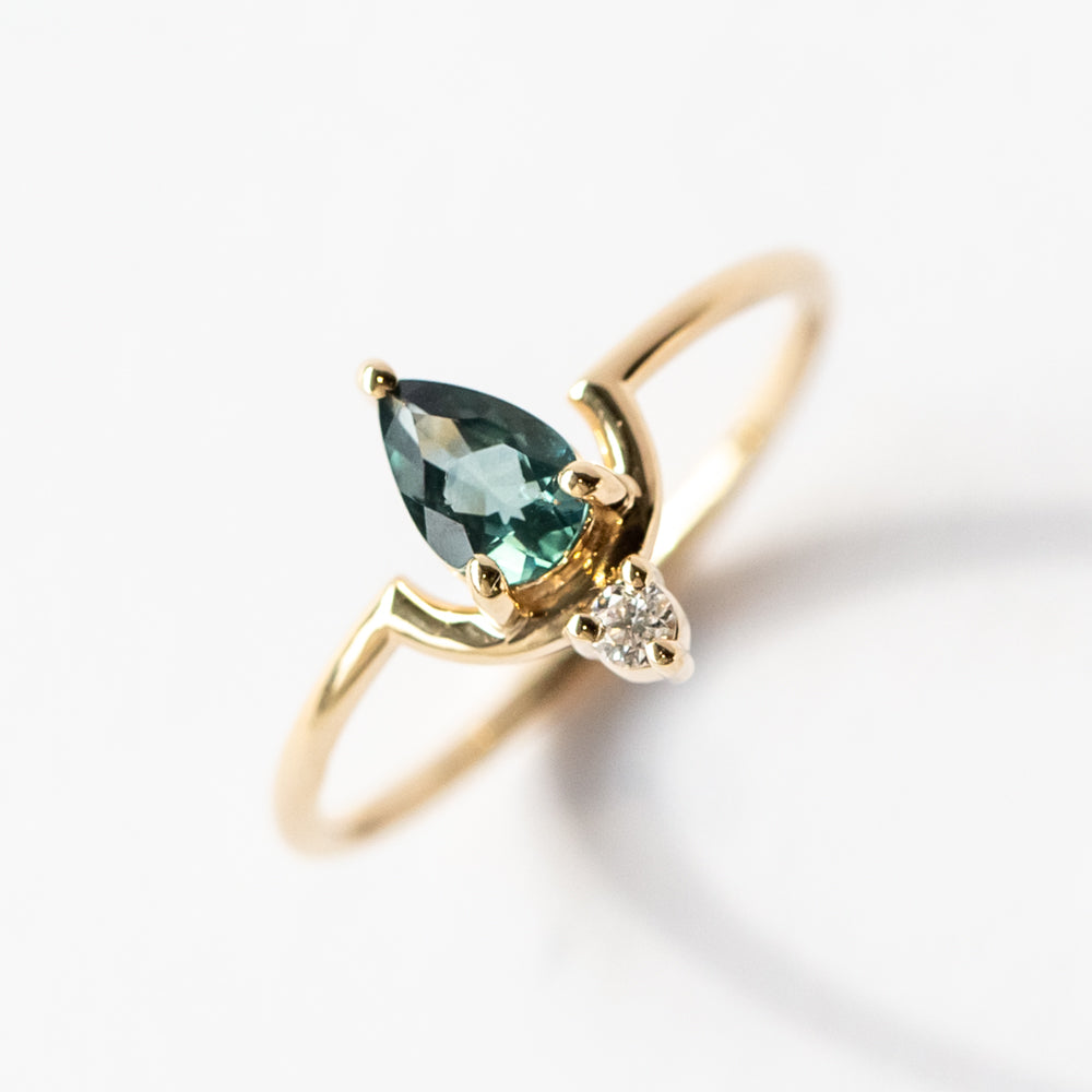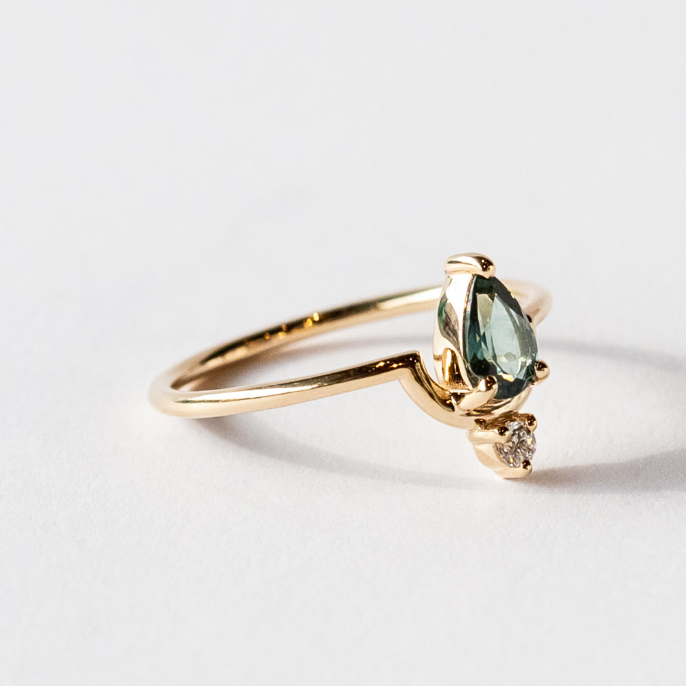 In this graphic, colorful gemstone ring from Wwake, a deep teal sapphire nestles in their signature gold arc design, appearing to float mid-air, accentuated by a delicate diamond accent. It's light, ethereal, and offers a dose of rich color.