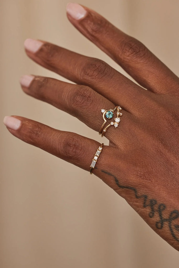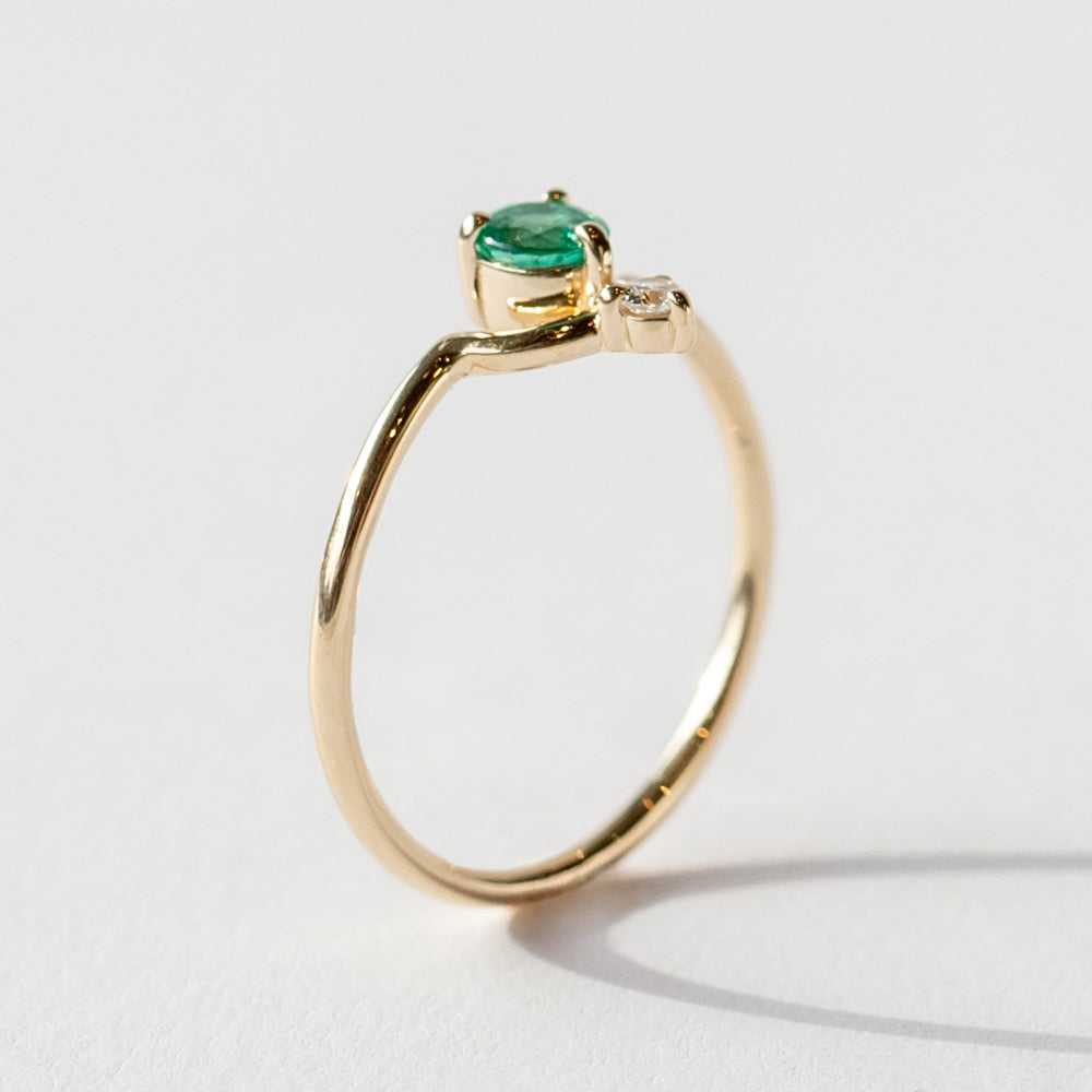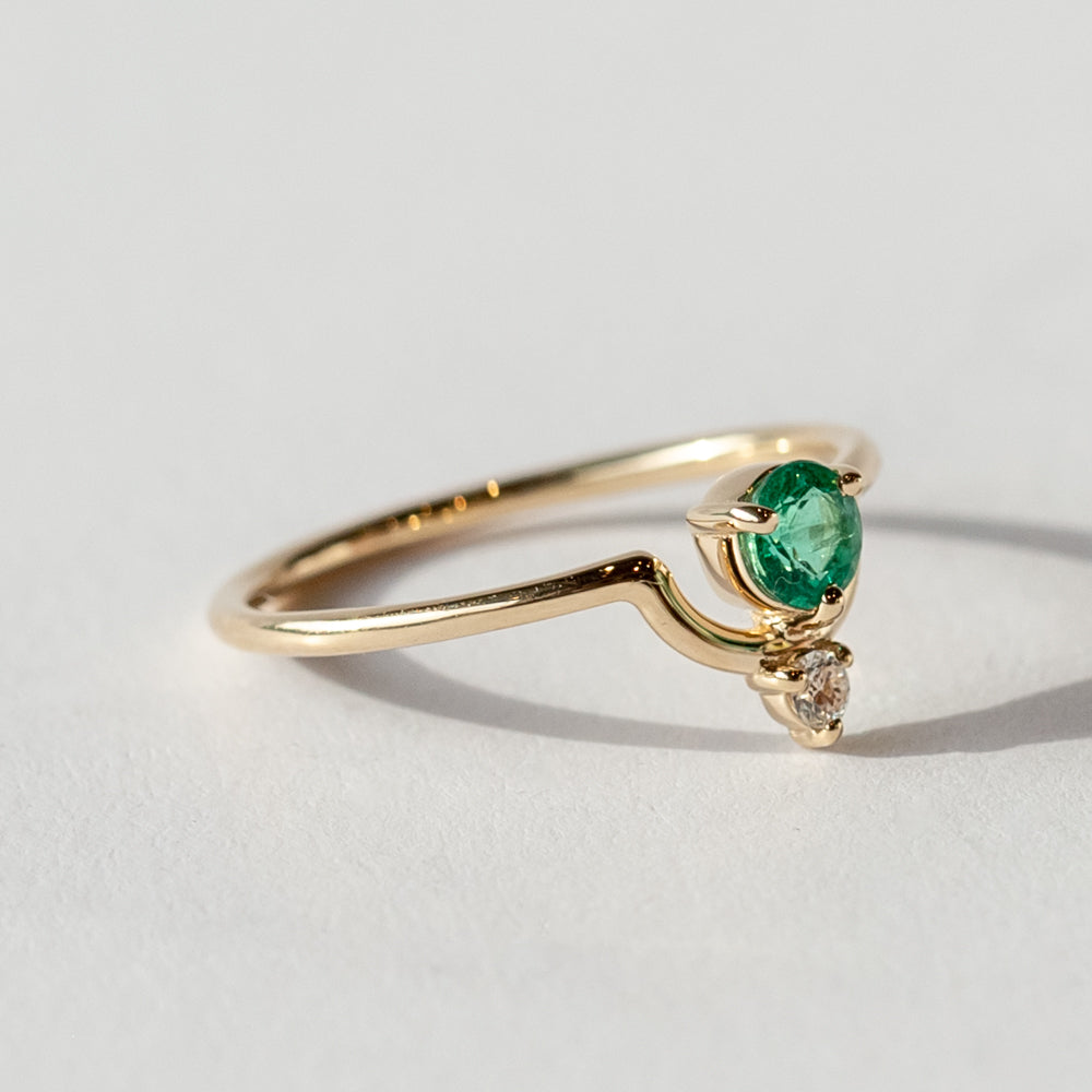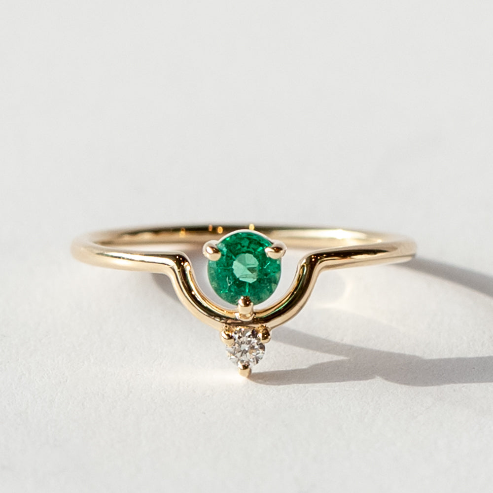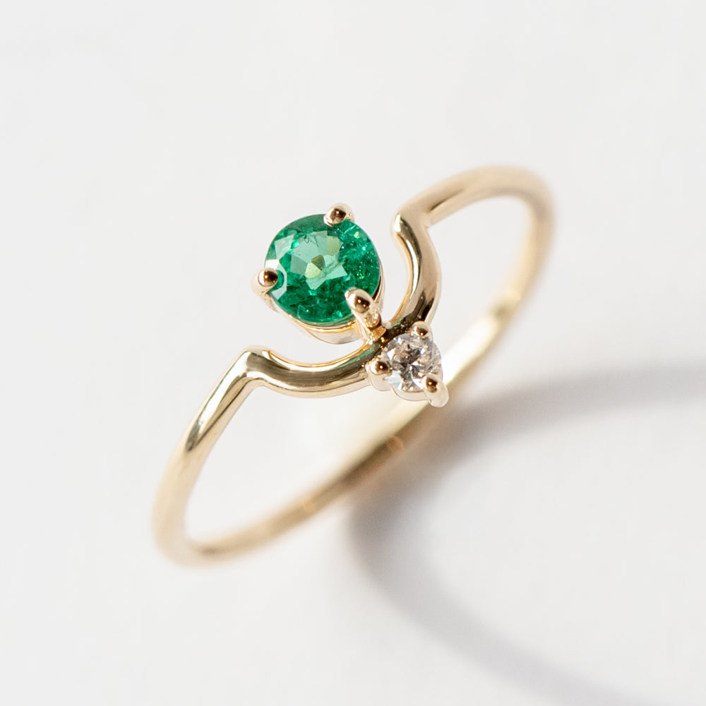 Shimmering and colorful, this emerald and diamond ring from Wwake gives you a pop without overwhelming your style. It features a graphic arc, with a vibrant green emerald nestled inside, accented by a tiny white diamond. A slender gold band finishes the look with the perfect amount of shine. Emerald, the birthstone for May babies, is known for its lush green color and connection to renewal and growth. It’s considered a stone that supports fresh starts and strengthens intuition. Wear it solo for a minimalist look or stack it with bands to create a look that's all your own.