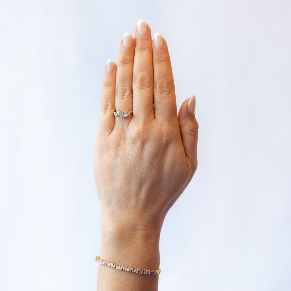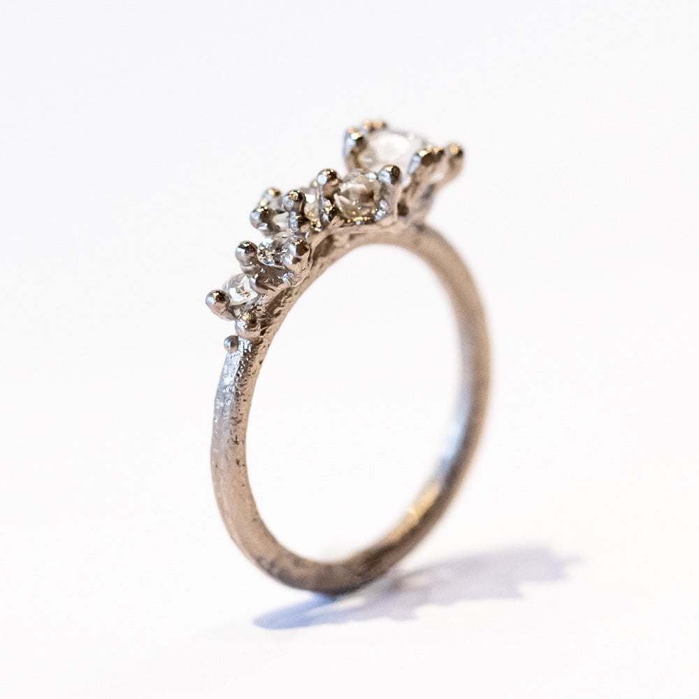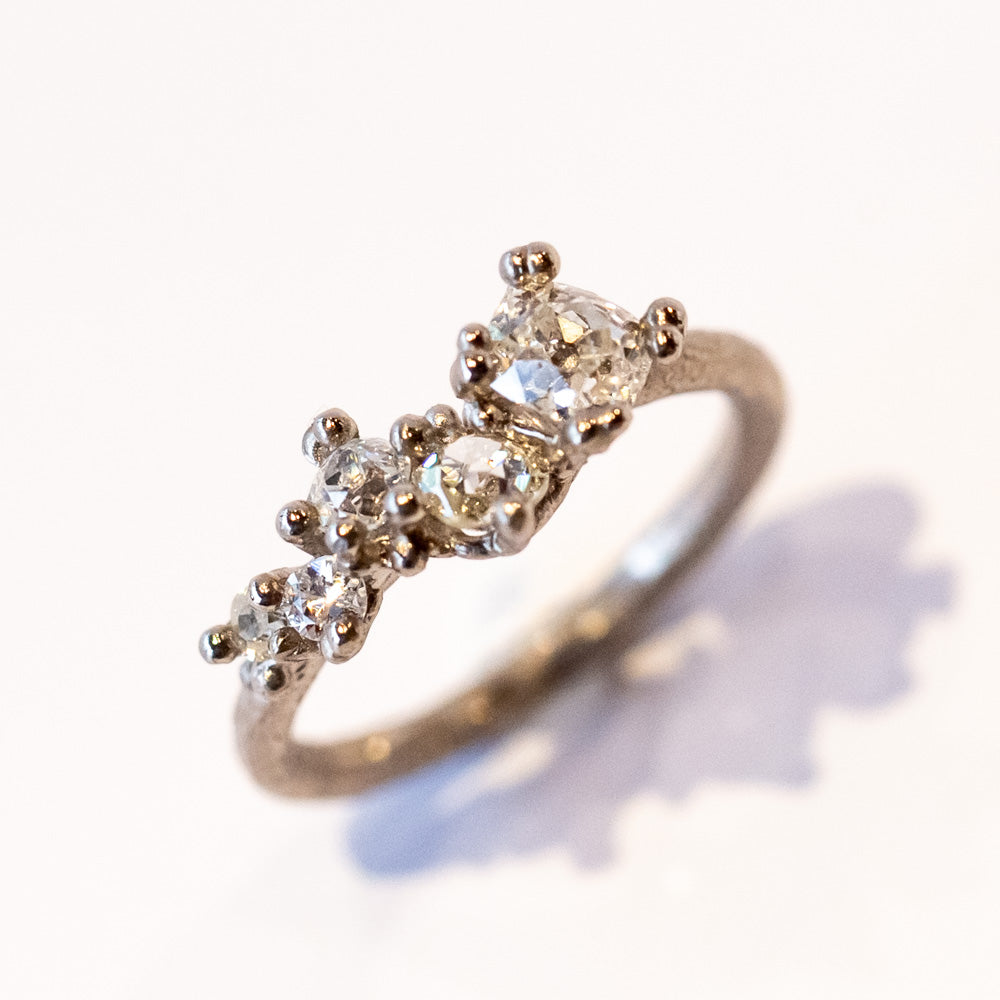 An alternative engagement ring featuring a tapering cluster of antique cut white diamonds, all nestled amongst polished granules of white gold on a textured bands