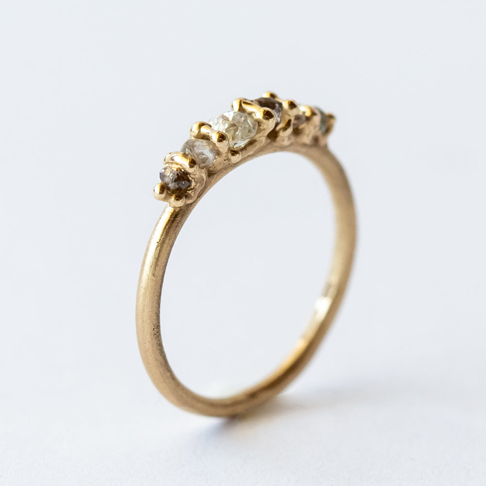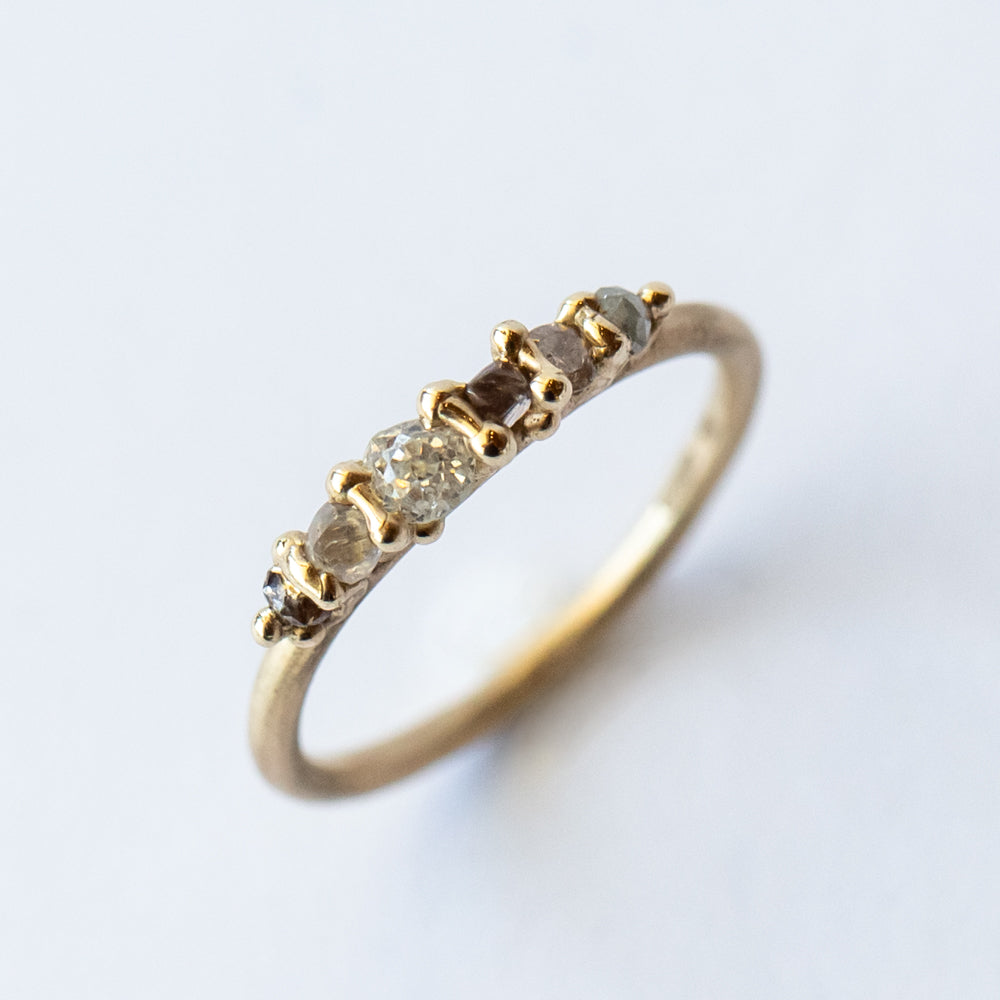 Why stick to the script when you can have a ring as unconventional as your love story? This six stone mixed diamond band from Ruth Tomlinson is a celebration of texture, history, and craftsmanship. Set in warm 14k yellow gold, it features a curated mix of raw, rose cut, and old cut diamonds, each one unique and full of character. Tomlinson’s signature golden granules add a touch of organic texture, making this piece feel like it was plucked from the depths of an ancient treasure chest. It’s the perfect choice for someone who loves their jewelry with a bit of mystery and a lot of personality.