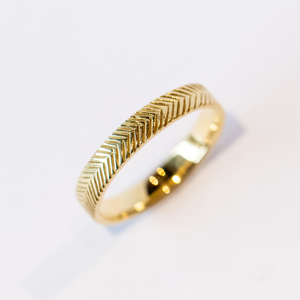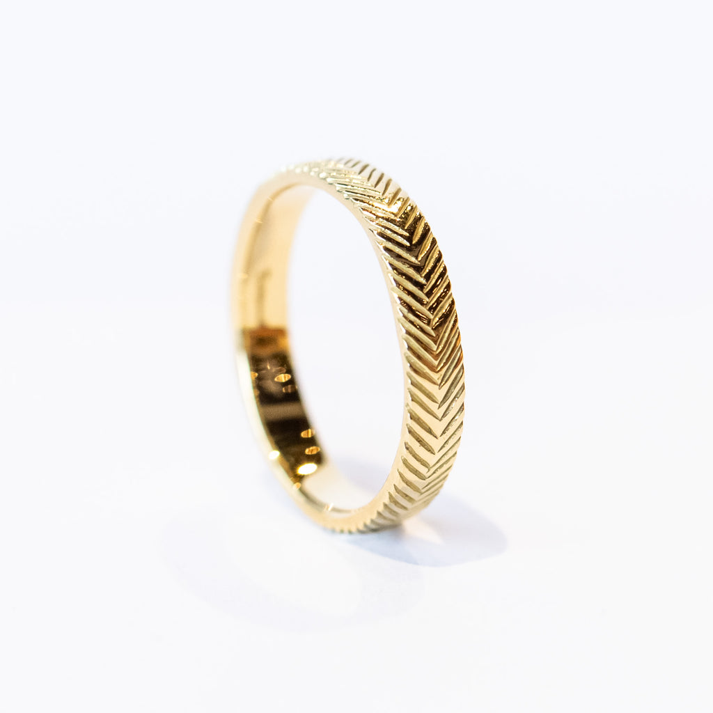 Add some artistic texture to your look with this simple everyday gold wedding band. The flat profile gold band is engraved with a classic herringbone pattern, adding interest and depth to its surface. The inside is finished in a bright polish.