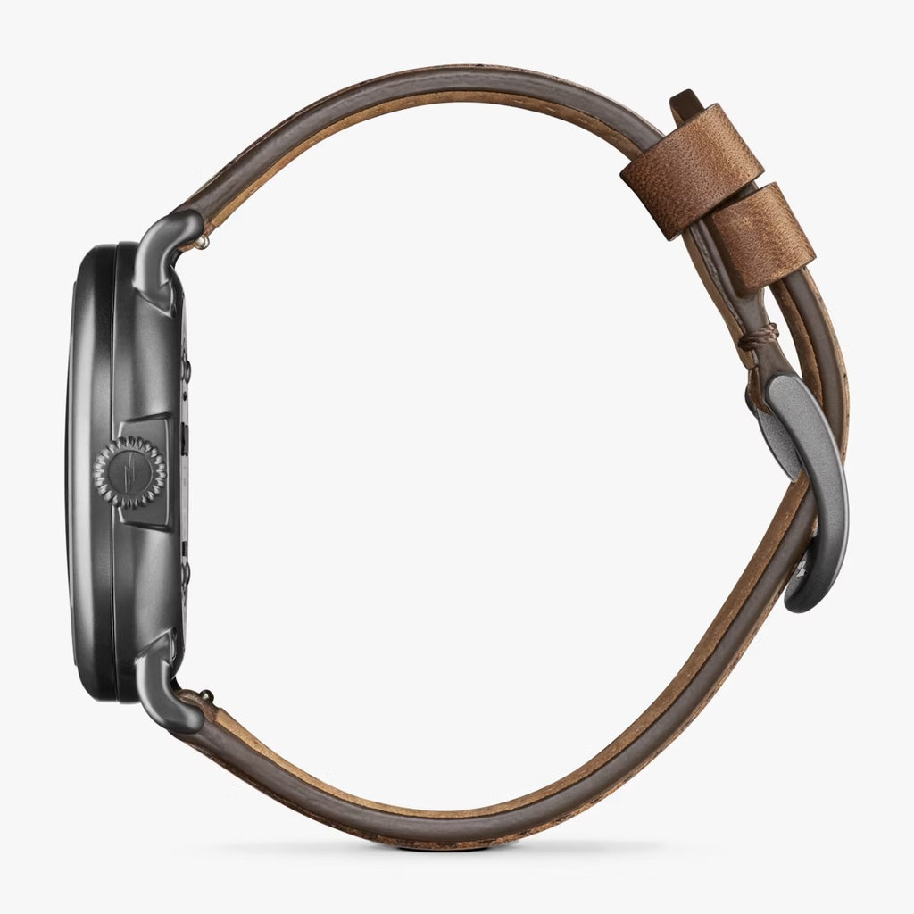 Perfect for any Michigander or frequent visitor of Lake Michigan’s shores, this Runwell has its own unique story to tell. With the sandblasted PVD gunmetal case and British tan leather strap, it’s an instant—and versatile—icon.