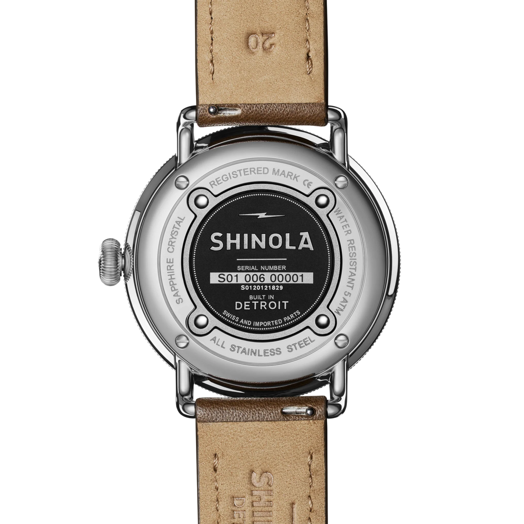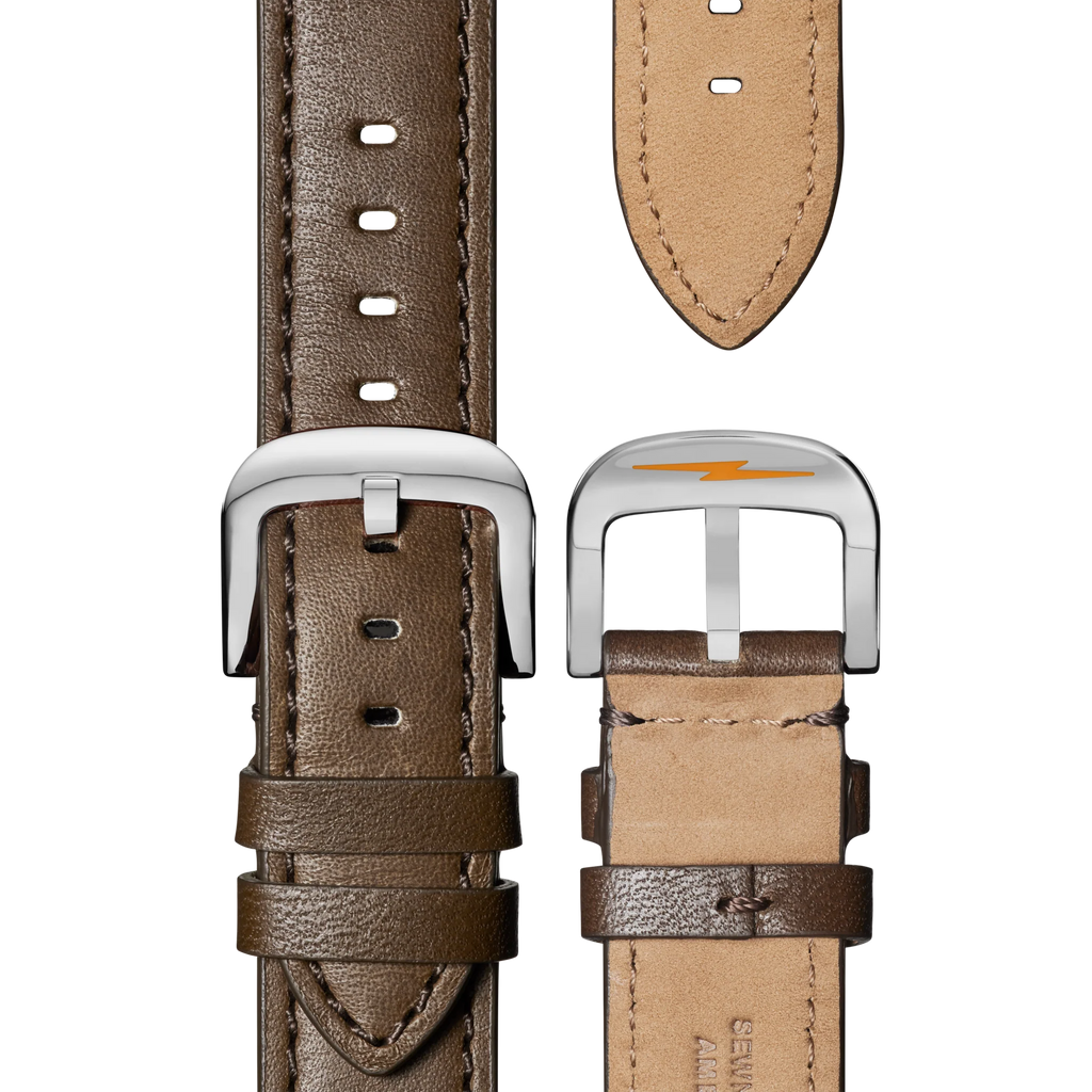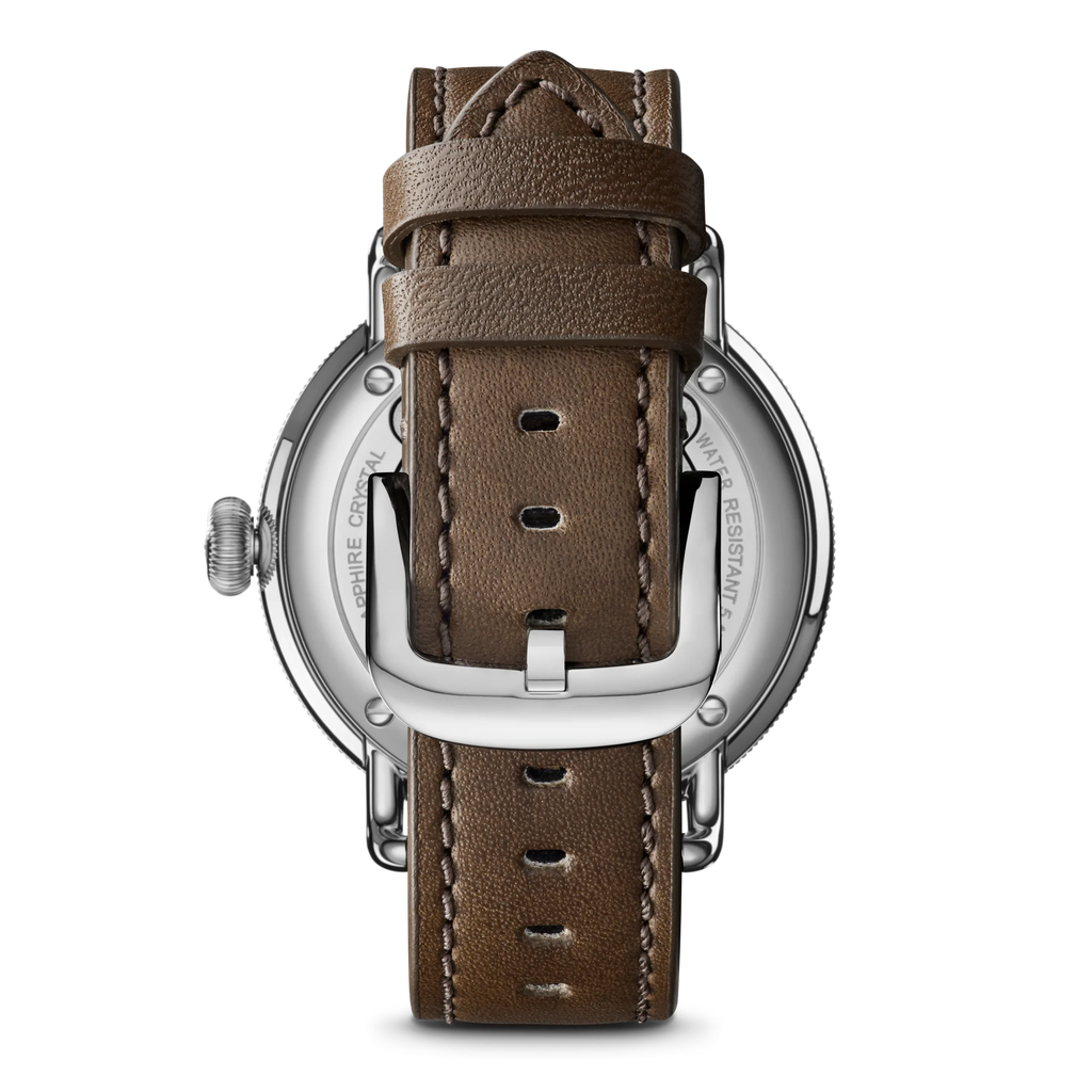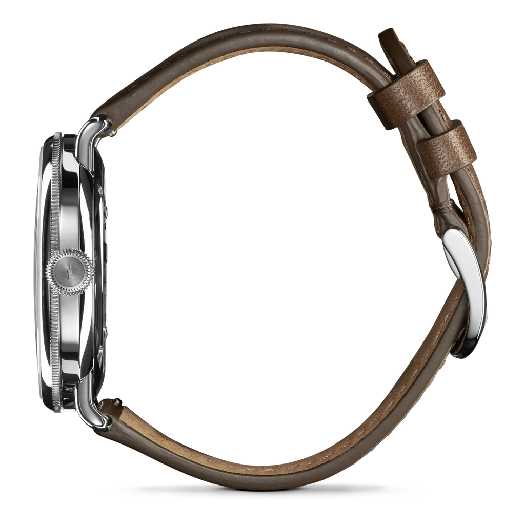 Go on, let your watch strike up a conversation. Delight at the clean, open dial made possible by top-loaded case construction. This 43mm Canfield shines with a polished stainless steel case and an alabaster dial punctuated with a calendar aperture. The timepiece is completed with a premium leather strap in dark nut brown.