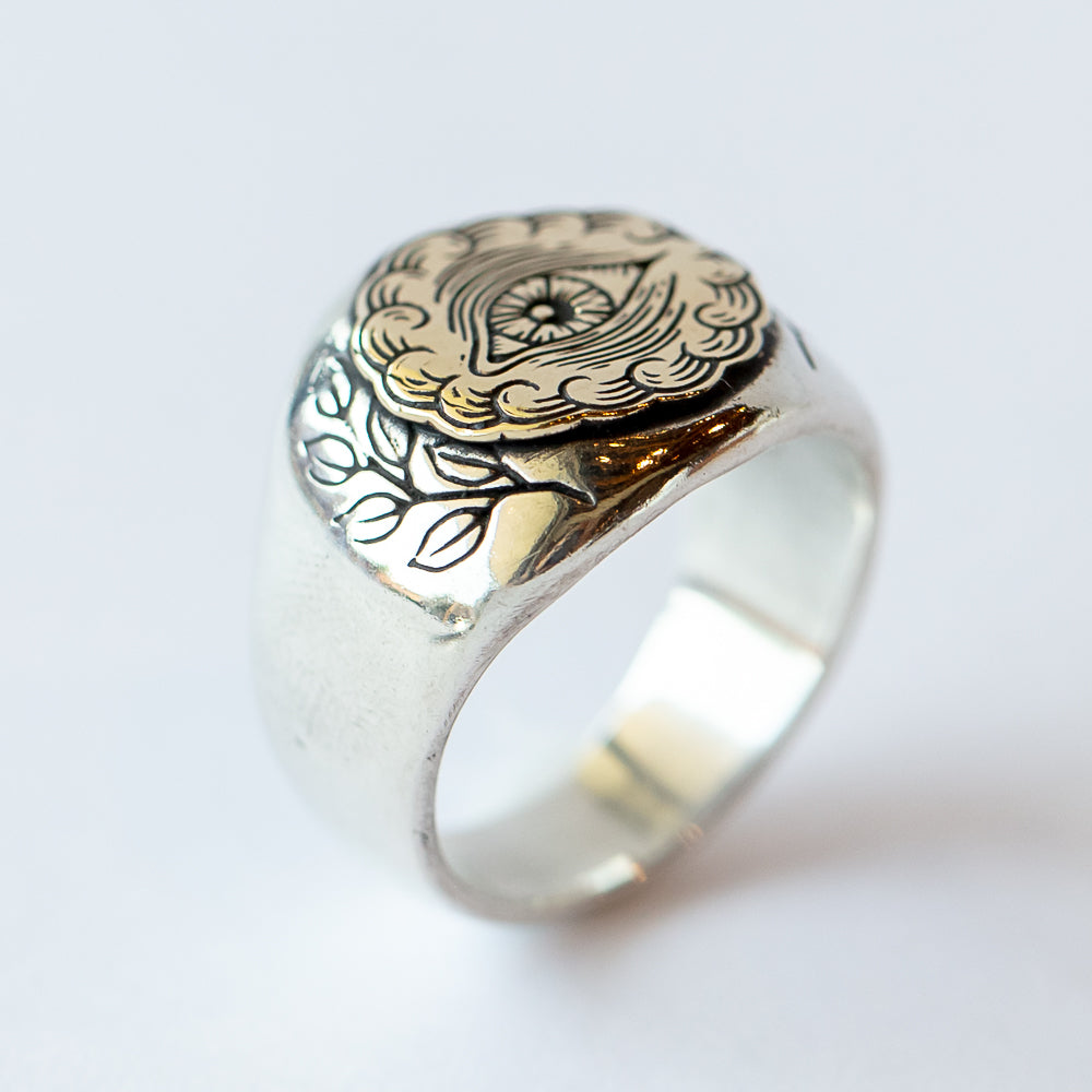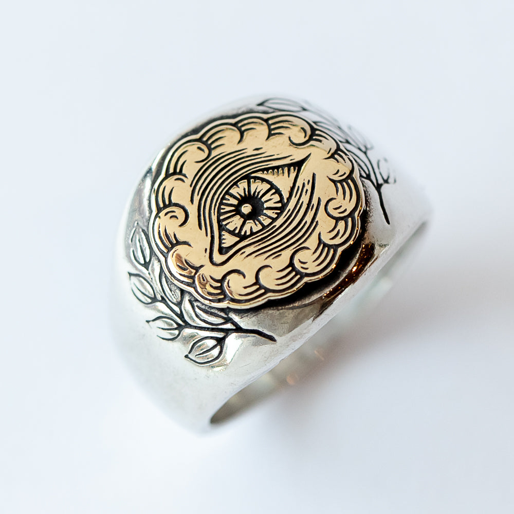 A profound symbol of supreme omniscience, the all seeing eye makes a statement engraved into 14 karat yellow gold in this chunky silver signet ring from Brooklyn designer Digby & Iona.