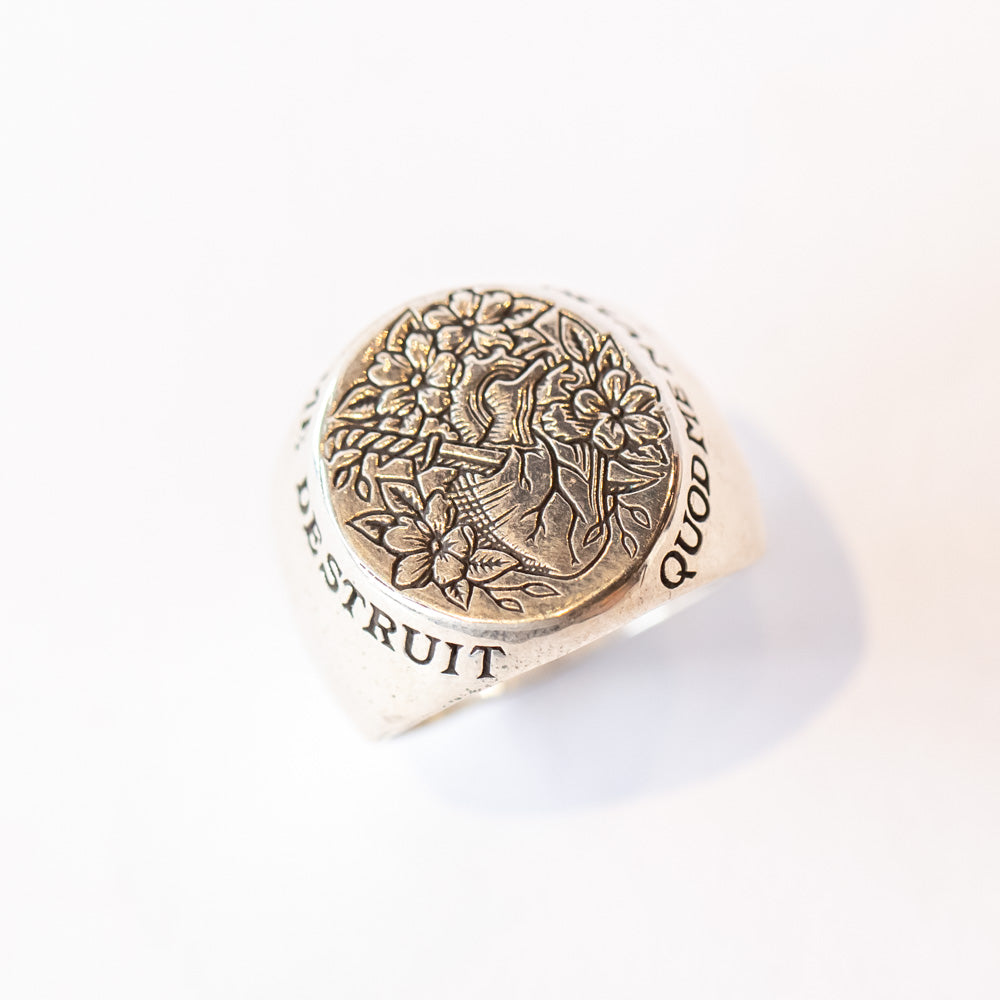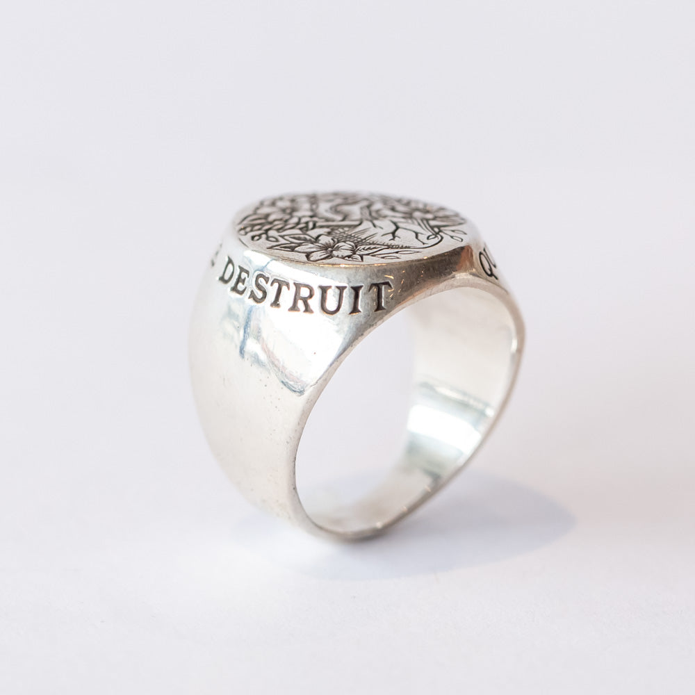 The Destruit Signet Ring is a bold, thought-provoking piece that combines powerful symbolism with striking design. Crafted in sterling silver, the oval face is intricately engraved with an anatomical heart pierced by a sword, surrounded by a bouquet of delicate flowers. The engraving is framed by the Latin inscription "Quod Me Nutrit Me Destruit," meaning "That Which Nourishes Me Also Destroys Me," capturing the paradox of love, growth, and pain. This ring is for those who appreciate deep, meaningful artistry with a touch of edge.