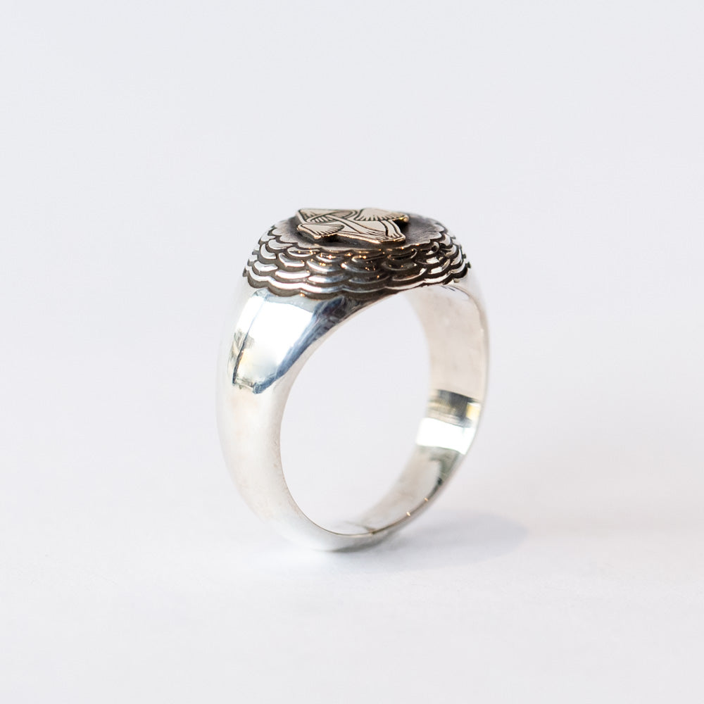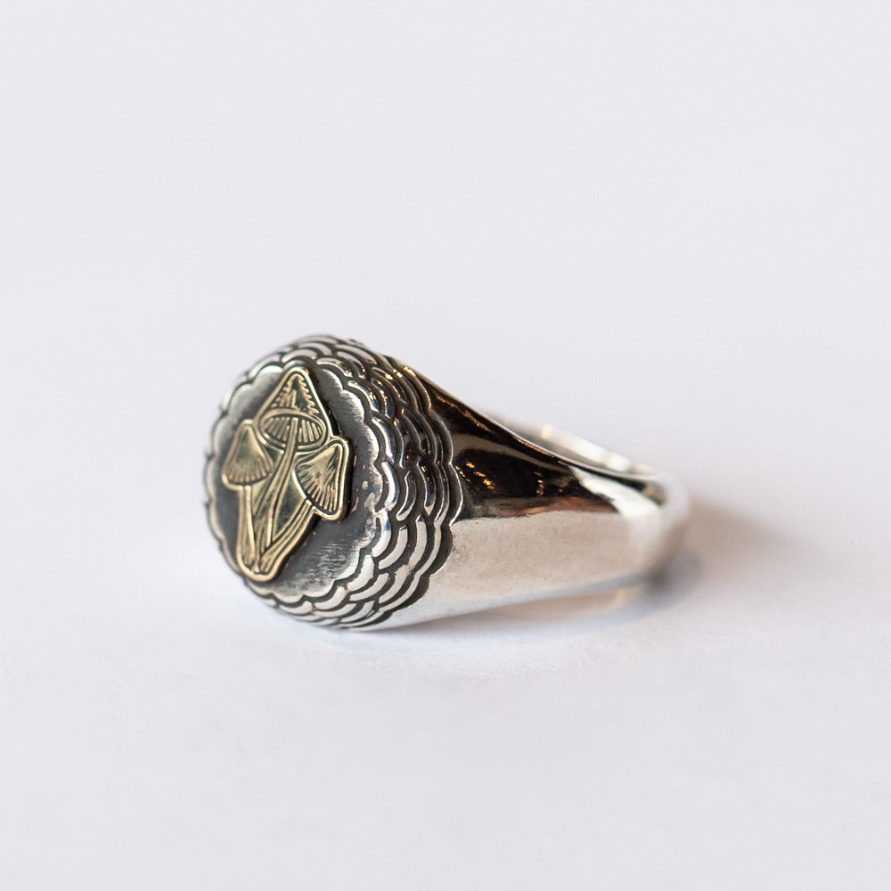 The Mushroom Signet Ring is a playful yet refined take on nature's most magical fungi. Crafted in sterling silver, its round face features a unique trio of mushrooms, beautifully rendered in solid 14k gold overlay. The mushrooms sit nestled in a delicate cluster, while the surrounding ruffled engraving echoes the organic, whimsical patterns found in the wild. This ring is for those who love a bit of nature's charm mixed with a touch of fine craftsmanship—perfect for making a statement while staying grounded in earthy elegance.