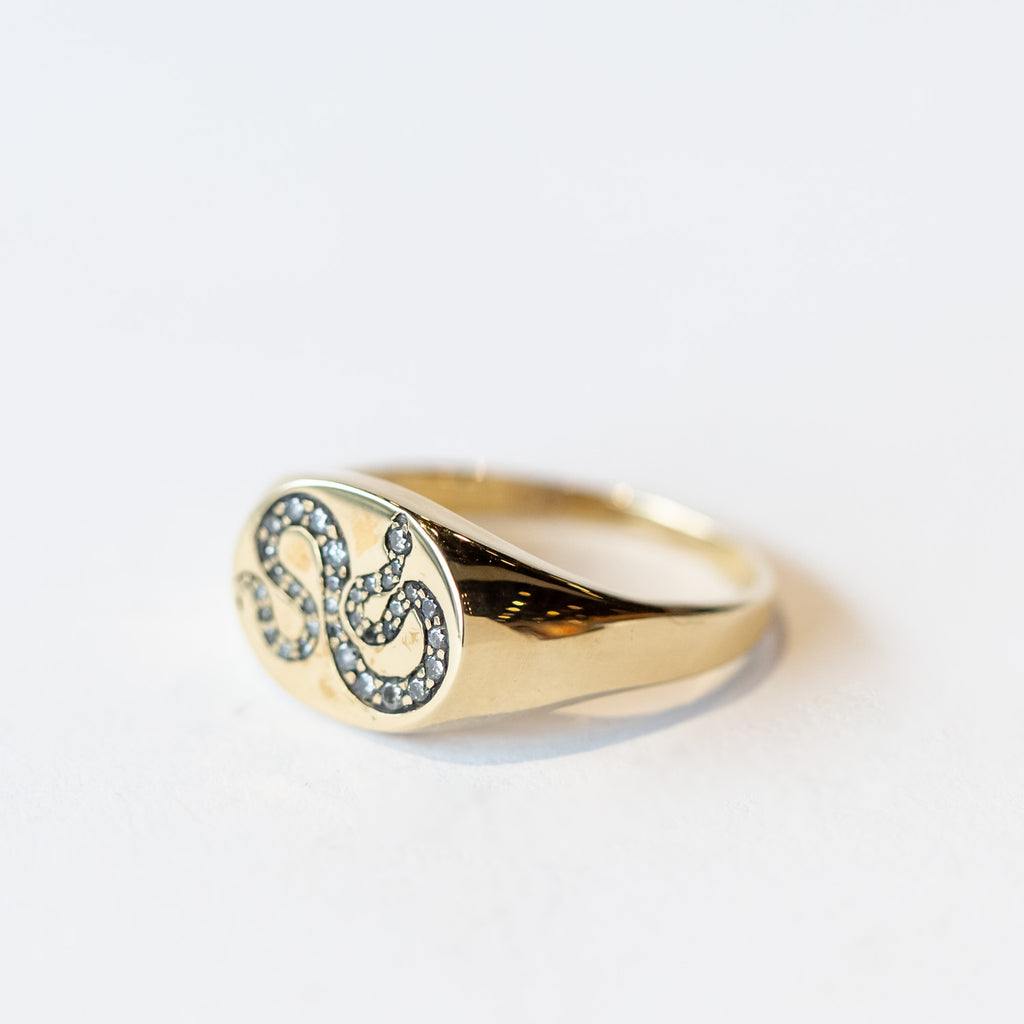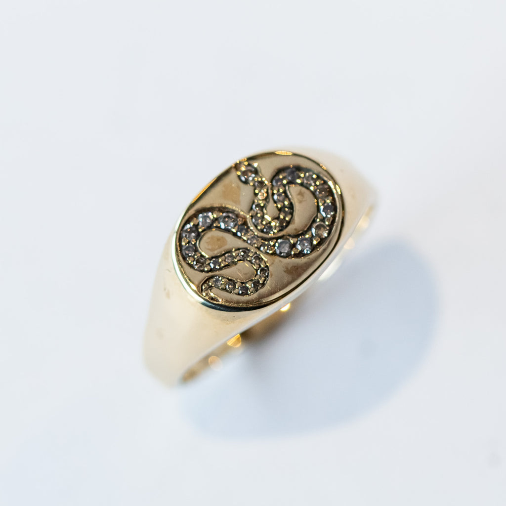A classic style with modern appeal, this Digby & Iona signet ring is a gorgeous gender neutral ring style fit for anyone. Handcrafted in bright 14 karat yellow gold, the oval face of the ring features an engraved snake design set with a row of sparkling salt and pepper diamonds.