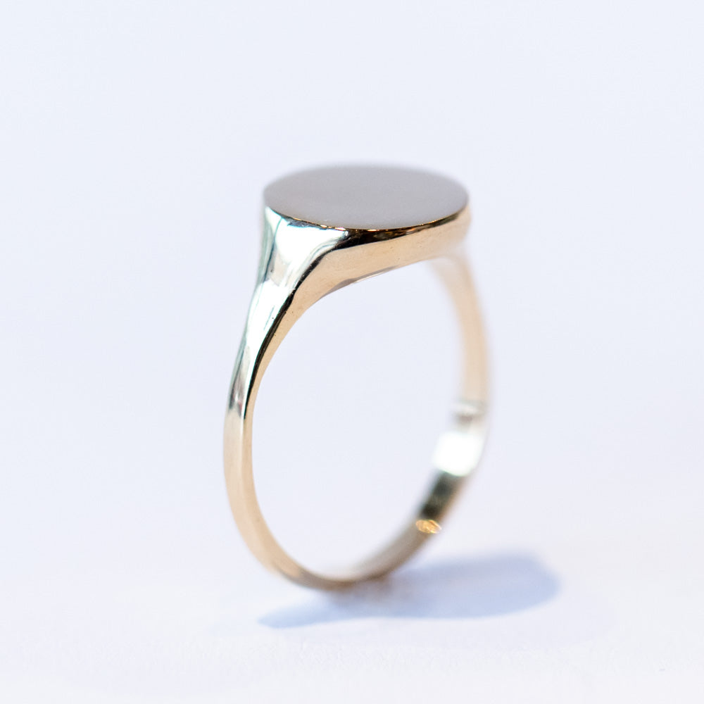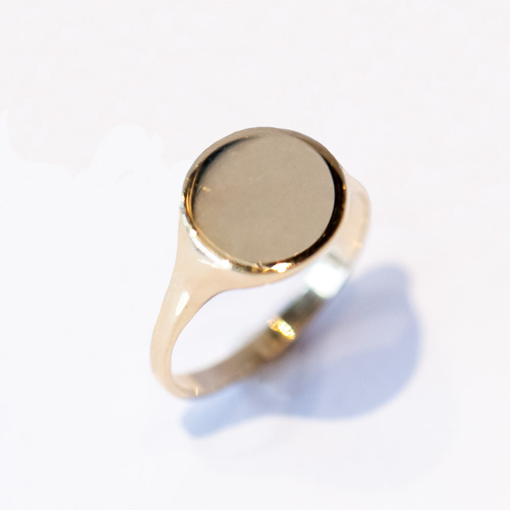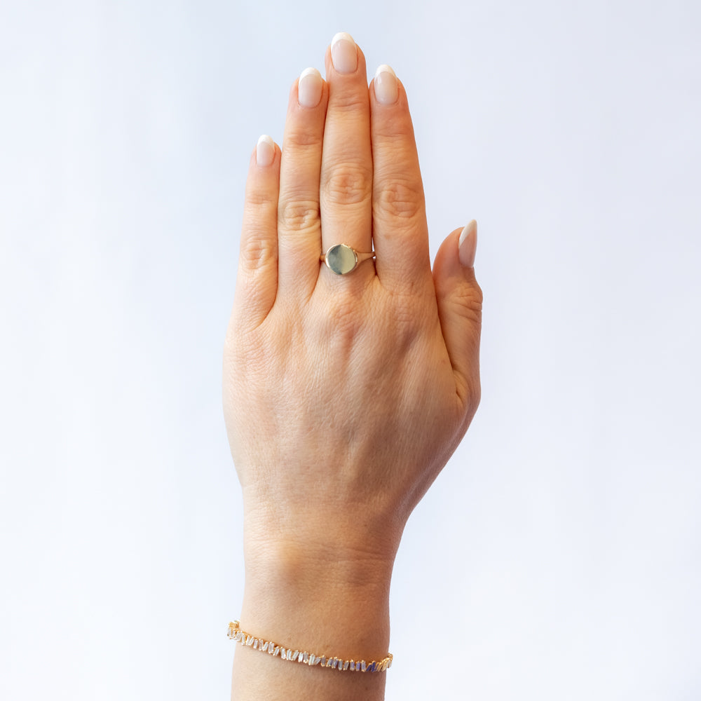 This iconic gold signet ring is your new BFF. It's sleek, bold, and effortlessly cool. Handcrafted in polished 14 karat yellow gold, it's the kind of piece that goes with everything in you wardrobe, whether you're heading to work or a night out. The signet style is totally on trend yet super classic at the same time—think old money meets modern minimalism that never goes out of style. So simple. So luxe. So you.