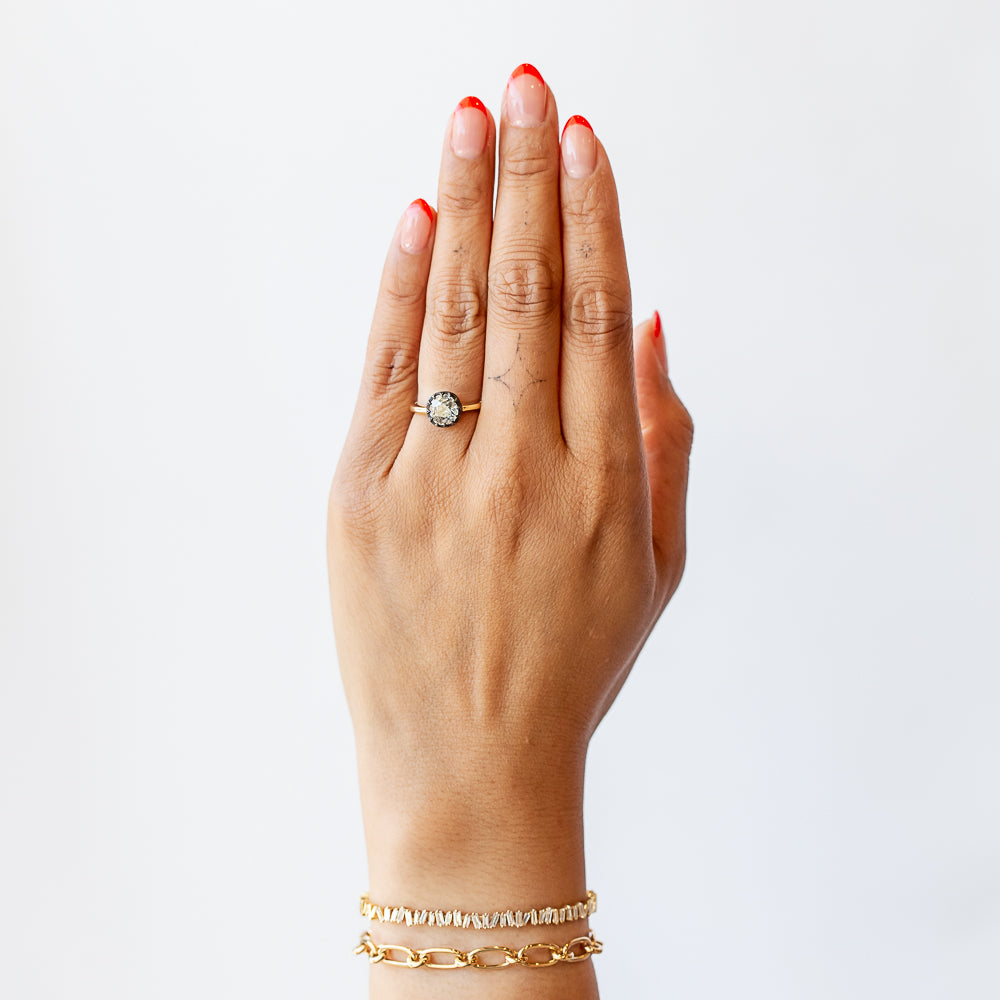 The rest of the ring—crafted in warm 18k yellow gold—brings warmth that balances the dramatic top. It’s a nod to Victorian-era styling with a modern twist, perfect for someone who loves timeless beauty but isn’t afraid to stand out. If you’re into pieces that feel storied, moody, and one-of-a-kind, Angelina is calling your name.