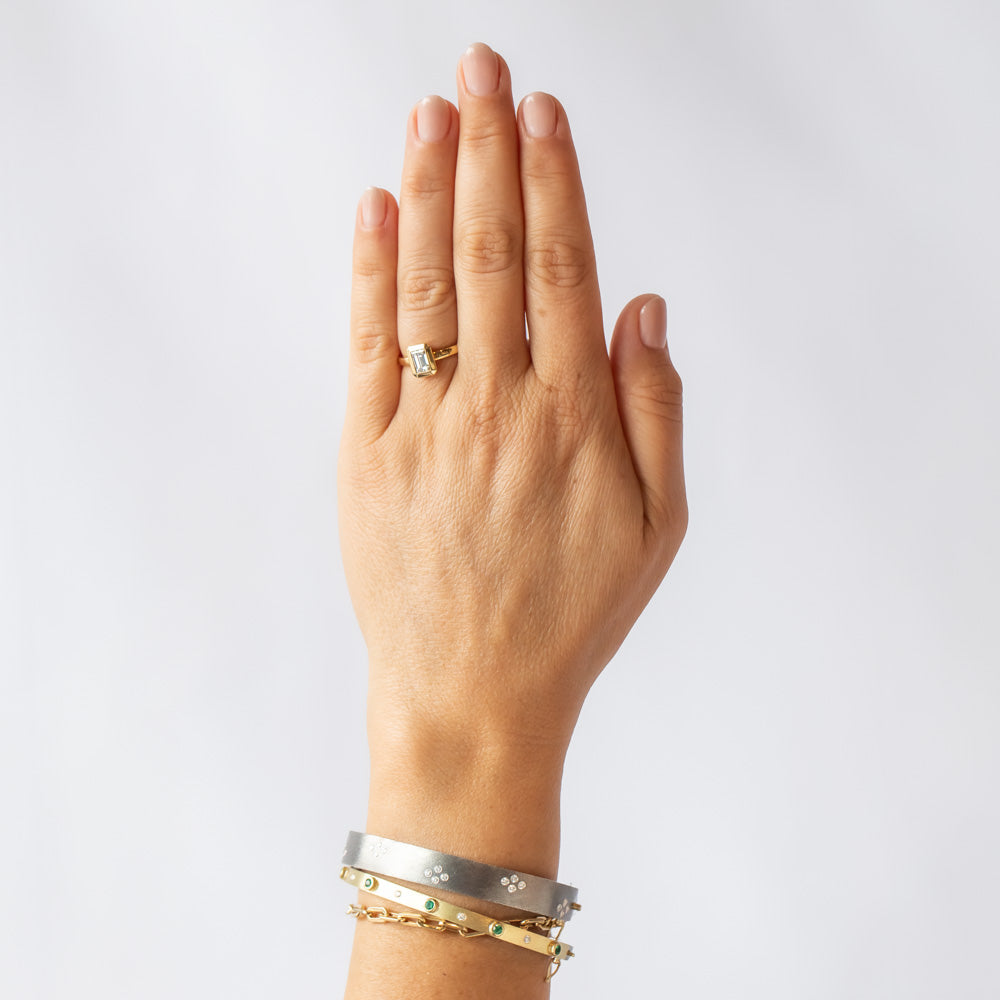 If you're looking for a standout solitaire engagement ring that screams modern beauty, look no further than Single Stone's Bea ring. This stunner might look simple (it is), but it's sophistication personified. Handcrafted in brightly polished 18 karat yellow gold, this beautiful ring features a rectangular step cut diamond in a chunky gold bezel. It's not quite an emerald cut, as it has pointed corners, making this diamond super unique. We're talking clean lines and easy-wear for active lifestyles here. Pair it with your fave wedding band for a ring stack that won't quit.