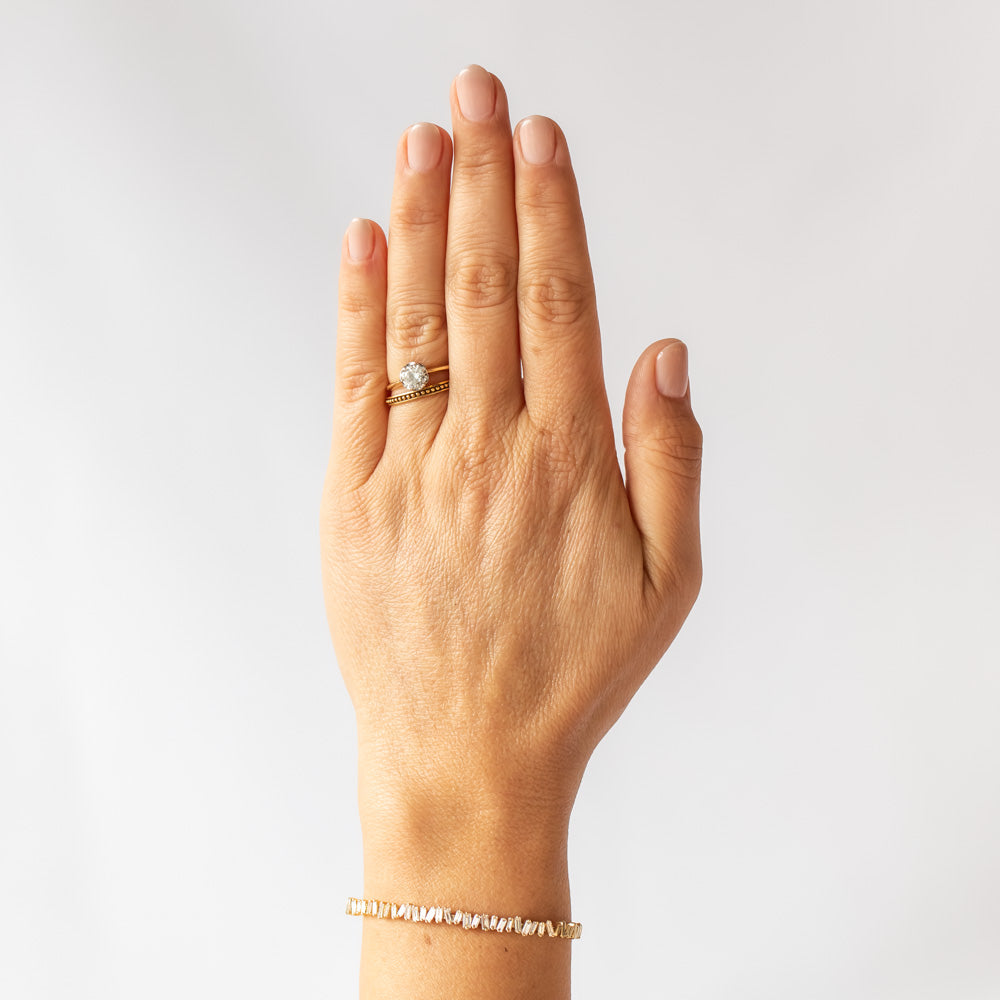 The Brinly band from Single Stone is a perfect throwback to ancient jewelry patterns crafted with a modern, sleek sensibility. Handcrafted in bright 18 karat rose gold, this wedding band features a strong bead detail all the way around, with smooth edges. The central depth is oxidized to create eye-catching contrast. Wear the Brinly wedding ring paired with your engagement ring, in your favorite ring stack, or solo for a bit of color and texture that stands out.
