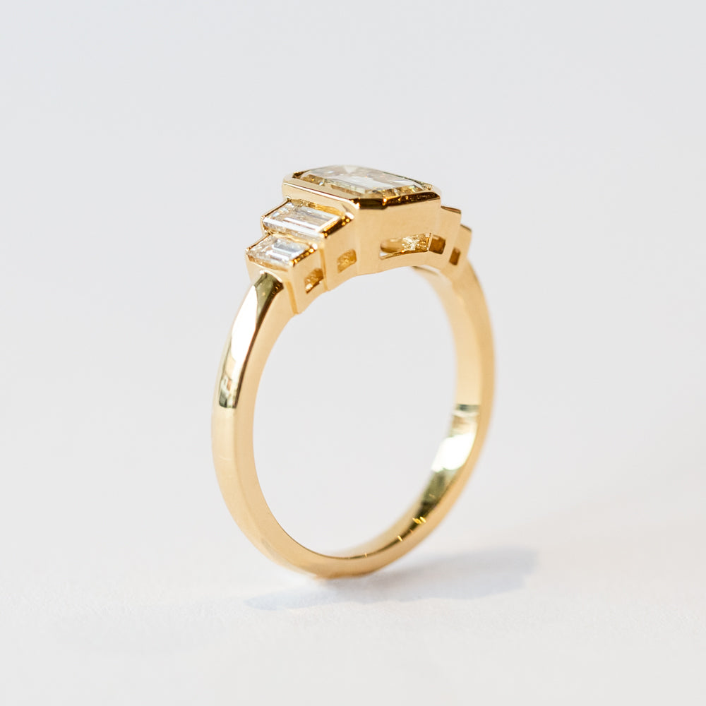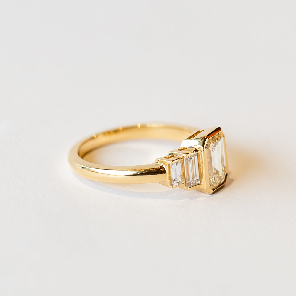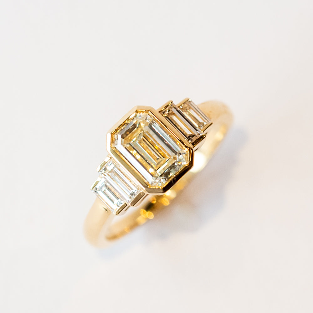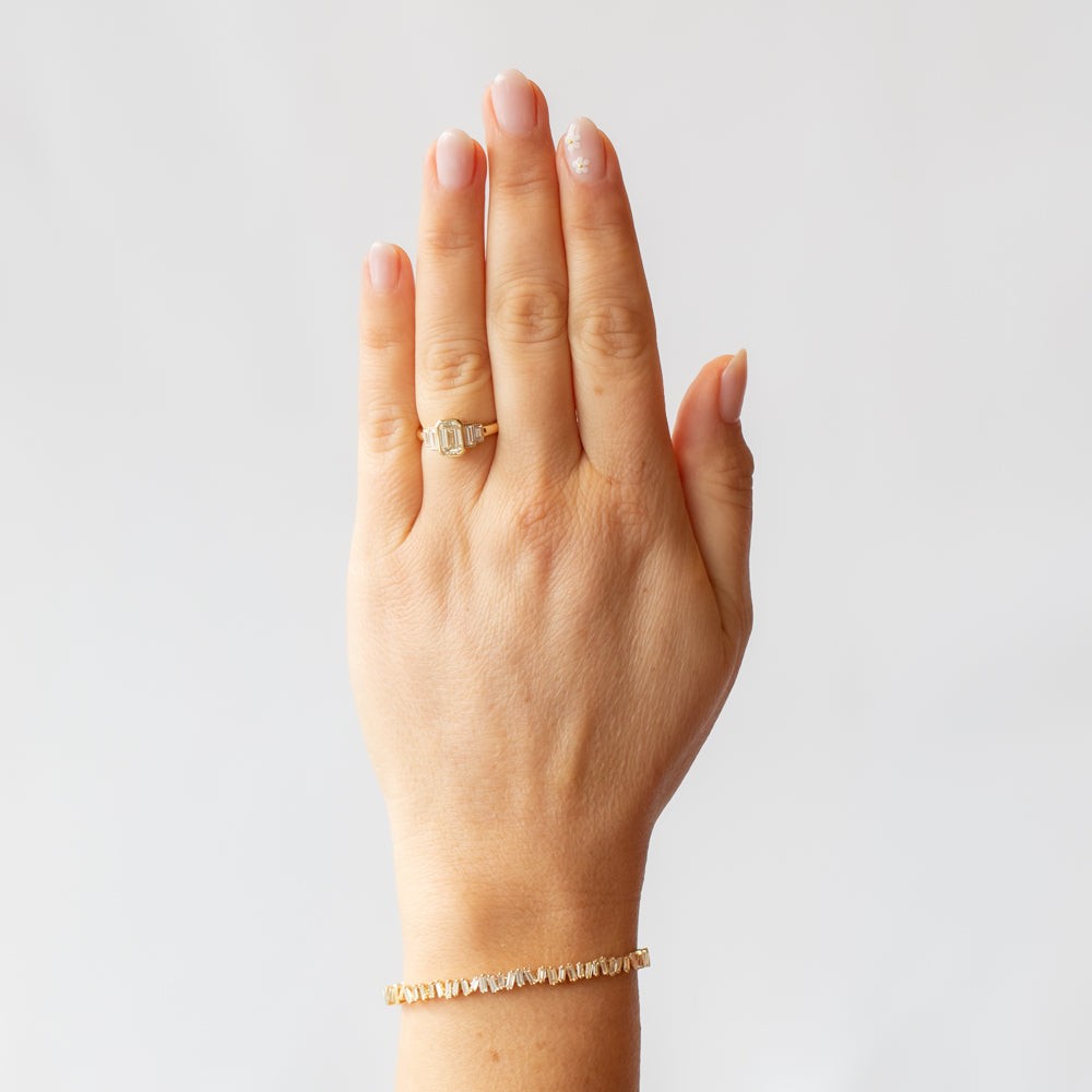 A shop favorite engagement ring style from Single Stone, this stunning Caroline ring features a 1.20ct emerald cut center stone flanked by four baguette cut diamonds for an Art Deco-inspired but utterly modern look.