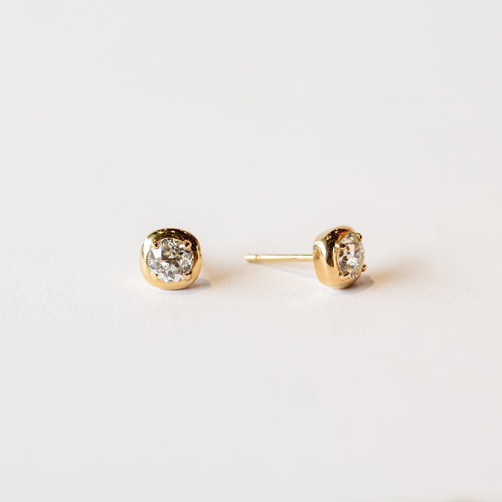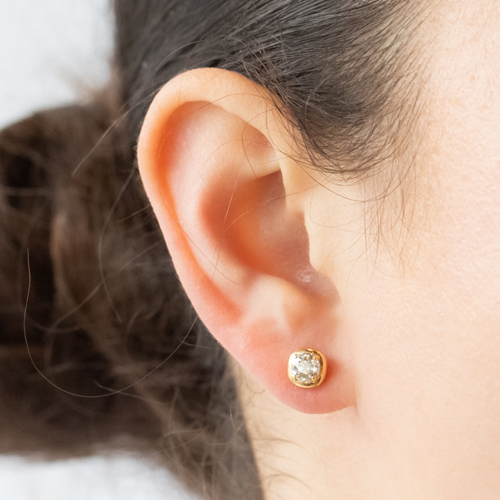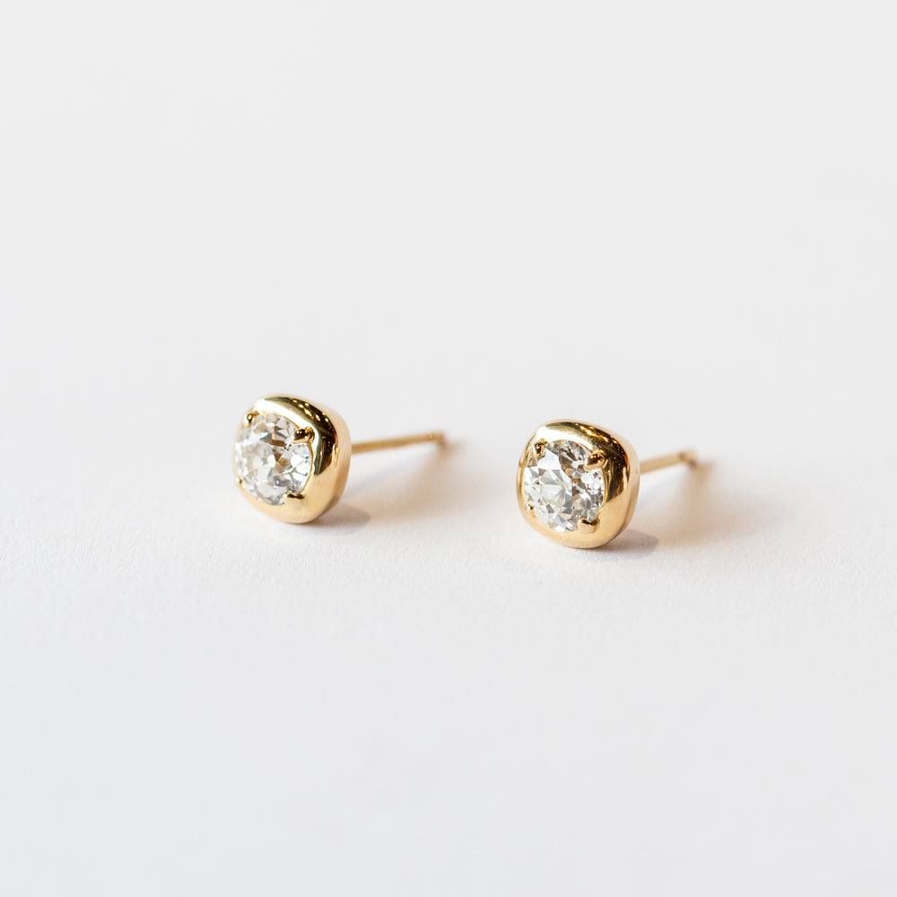 It's the unmatched glamour for us. These Cori diamond stud earrings from Single Stone are dripping in modern brilliance. Handcrafted in polished 18 karat yellow gold, the cushion-like settings of these earrings hold two old European cut diamonds that glow from within. Their low profile prong settings lent them a contemporary appeal, yet these diamond studs are forever timeless. Wear them alone as a standout pair or layer them with other earrings in multiple piercings for a on-trend look.